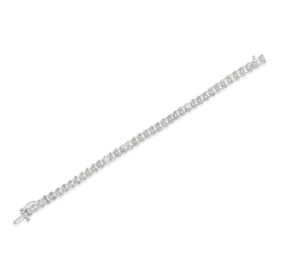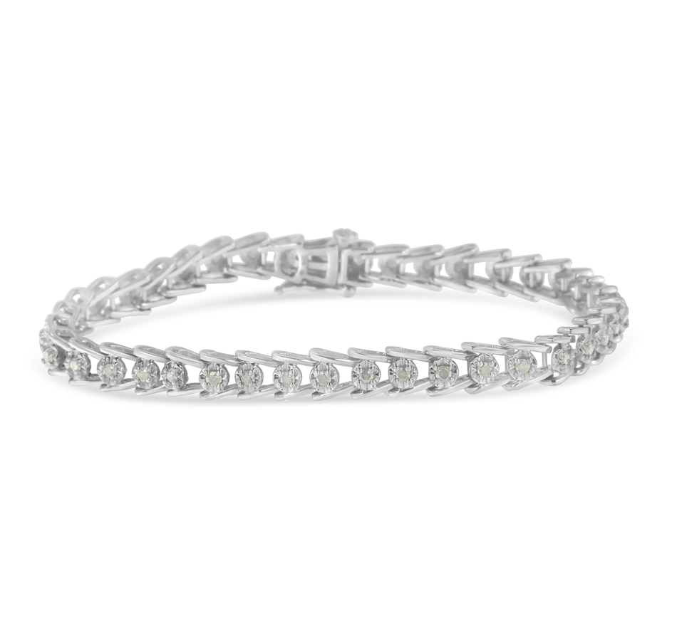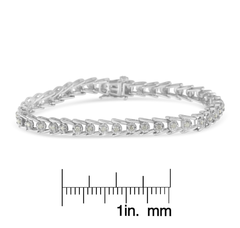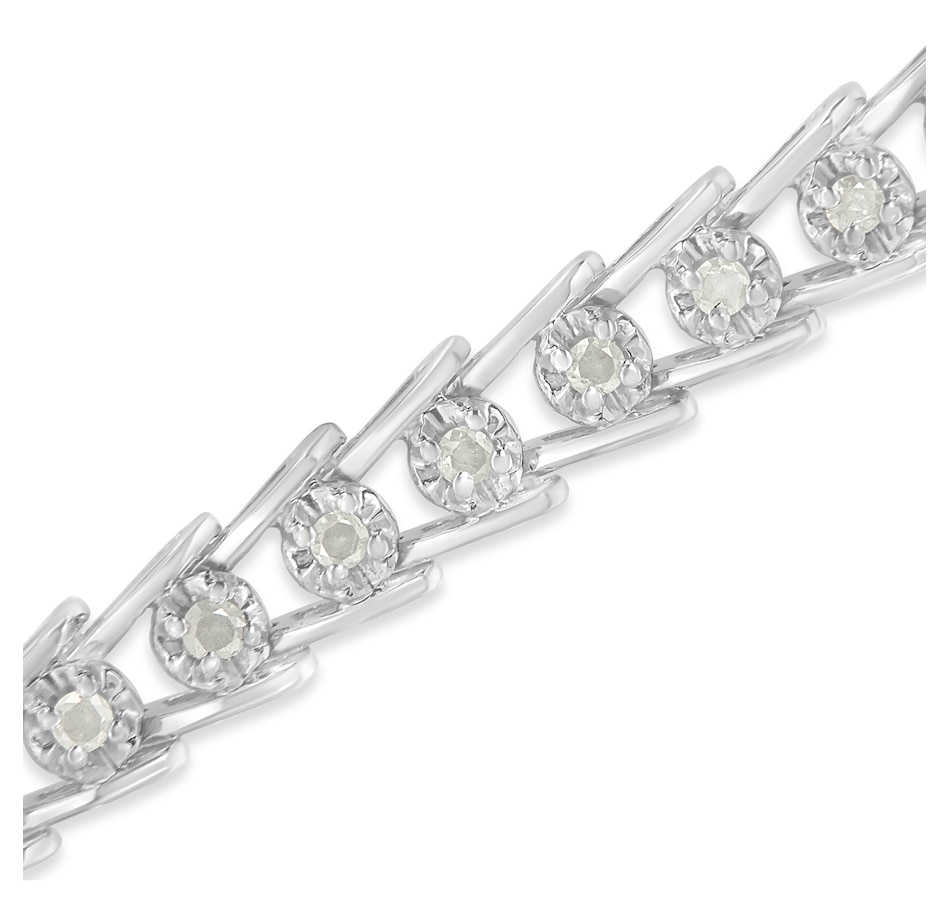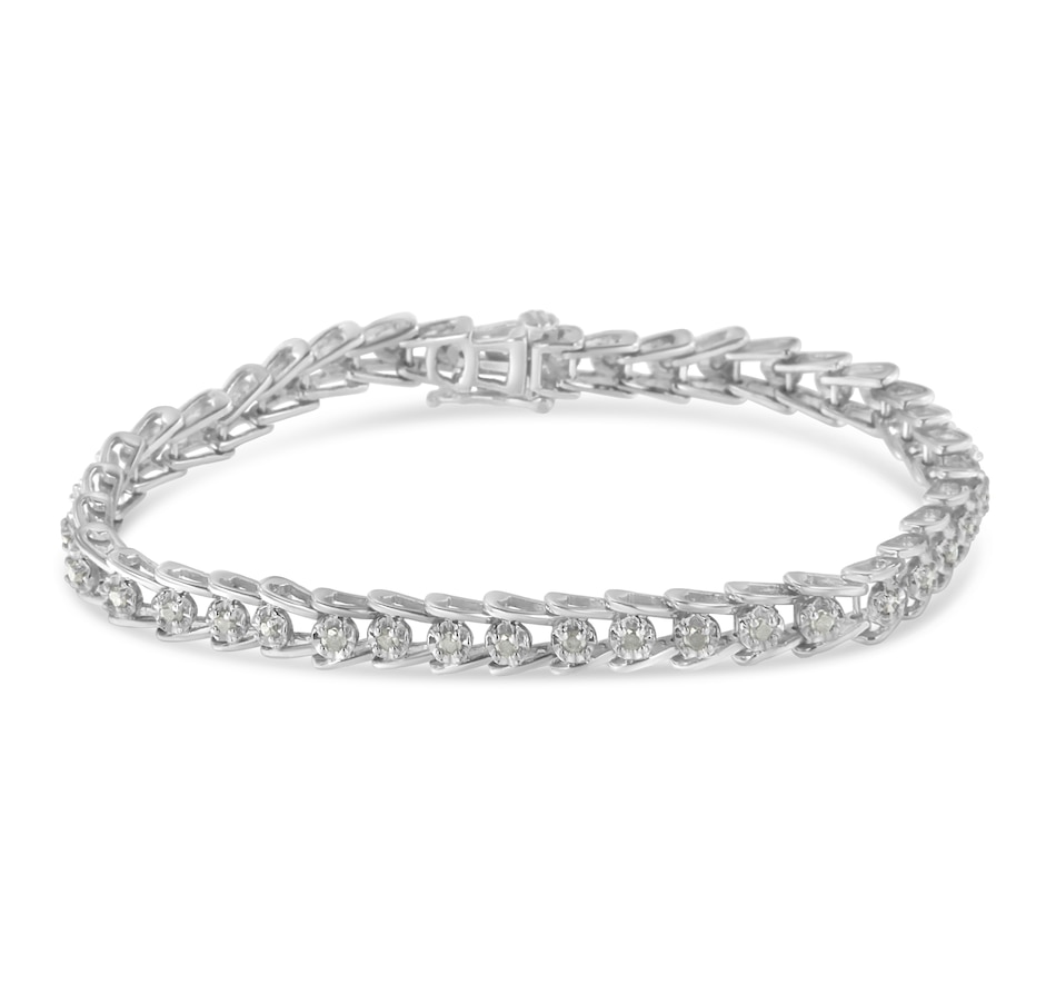 Illuminate her wrist with this alluring sterling silver bracelet, set with a wave-link design. This piece has 40 rose-cut promo quality diamonds, which are on the lowest of the diamond color and quality scale. Rose-cut, promo quality diamonds are milky and cloudy in nature. They have asymmetrical ball shape and are filled with inclusions. The diamonds are set in a prong setting, and will add a bit of shimmer to any outfit, casual or formal.