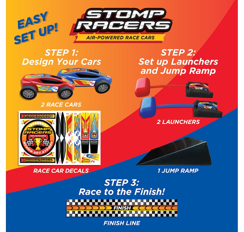 • Play inside or take Stomp Racers to the park or on vacation. Race your friend to the finish or jump off the ramp for extreme racing and tricks