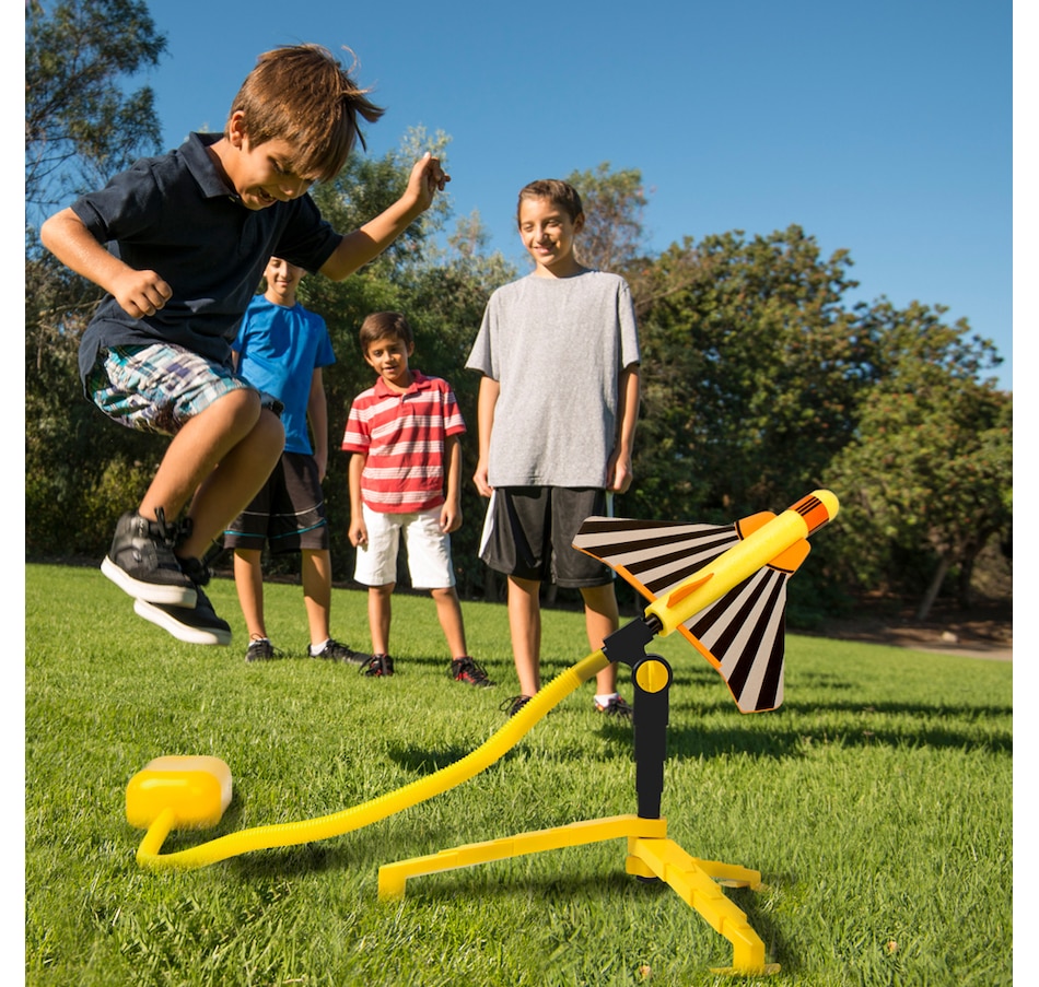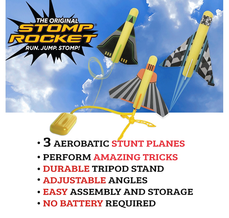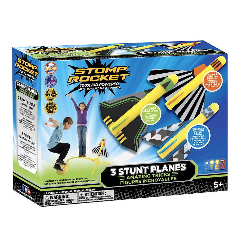 The original Stomp Rocket stunt planes set comes with three foam Planes and a toy air rocket launcher. This is a great, active STEM toy for both boys and girls, and suitable for ages 5 (6, 7, 8) and up. This is also ideal for promoting outdoor play too!