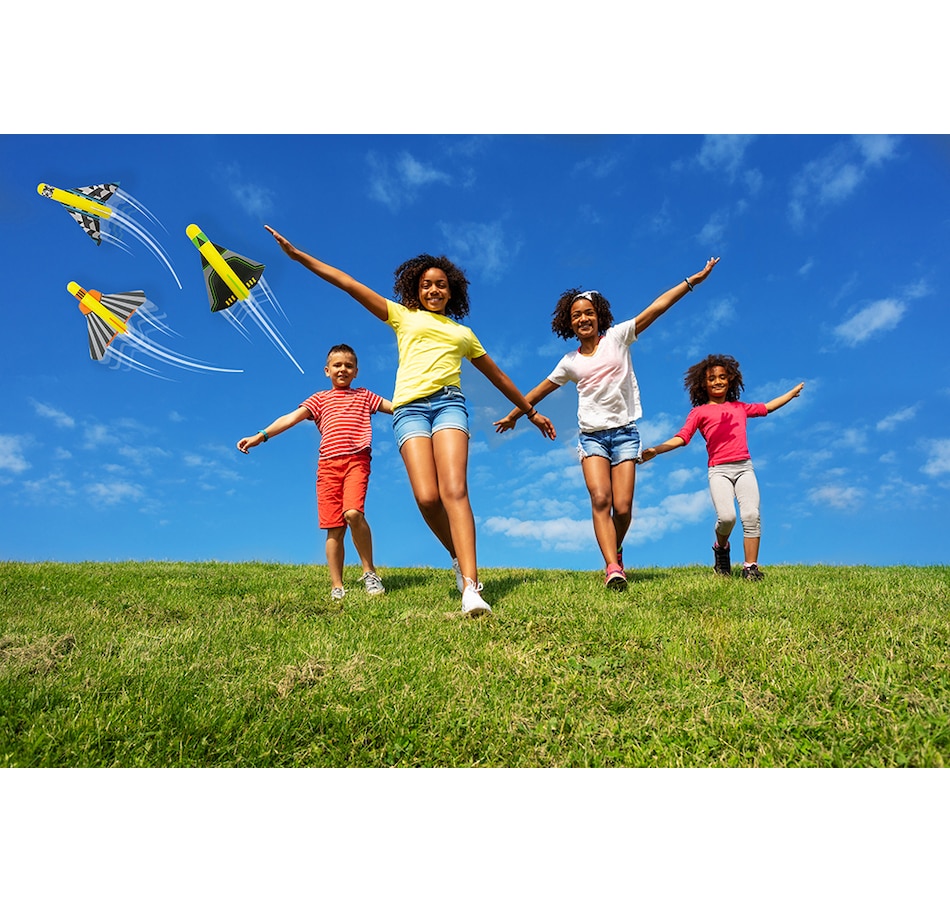 • Run, jump and stomp to launch the stunt planes; 100% kid-powered. No batteries required. Great for year round fun to get kids away from screen time and play with outdoor toys. This air rocket plane launcher is the perfect toys for girls and boys ages 5 and up.
