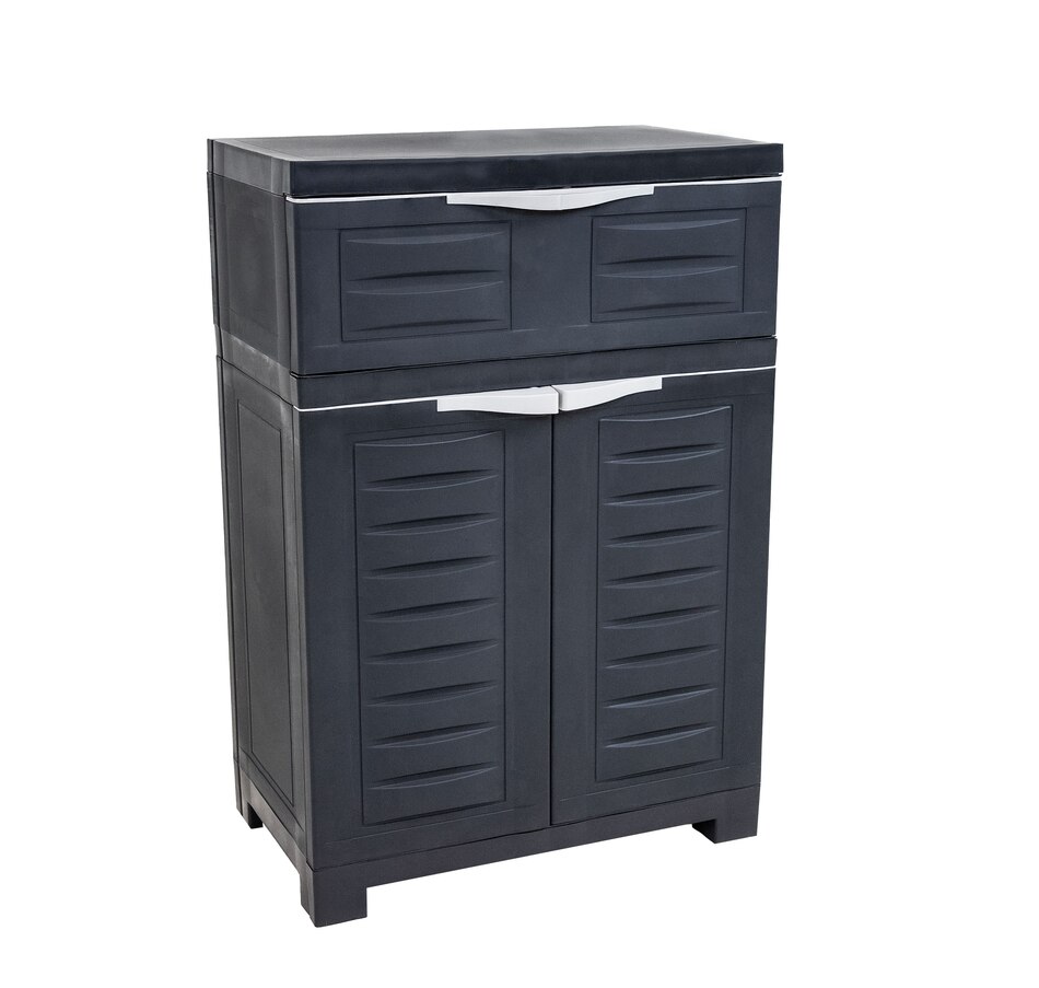 Make home organization simple by keeping household necessities neatly contained in this storage cabinet with adjustable shelves. The laundry room cabinet with doors features an adjustable shelf with a drawer on the top, providing plenty of space for storing cleaners, tools, office supplies, games, and more. Made from durable polypropylene, this plastic cabinet storage unit is designed for use indoors. The strong plastic material won't crack or peel. The shelf can be adjusted in 4" increments to accommodate various-sized items, like tall bottles of cleaner, planters, hoses, and other odds and ends. The opaque design of the cabinet keeps its contents out of sight for a neat and tidy look in any room. Whether it's used in the shed, basement, mudroom, laundry room, office, or elsewhere, this storage cabinet keeps a variety of items neatly organized and ready for use.