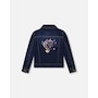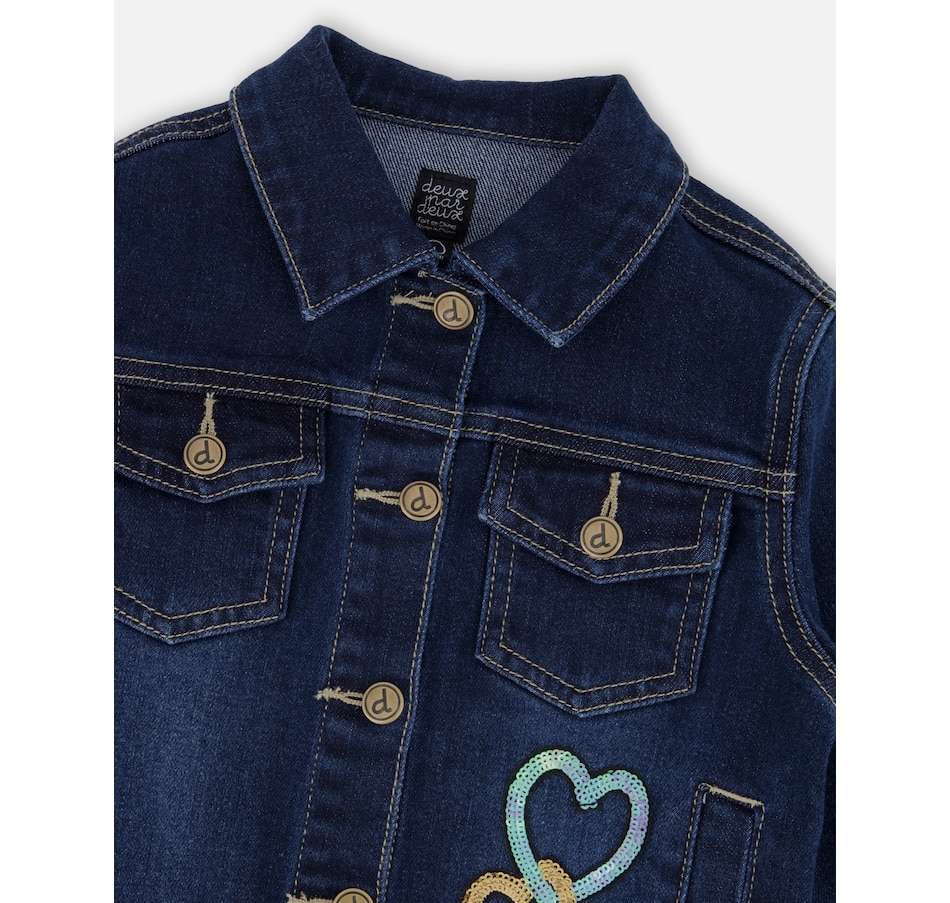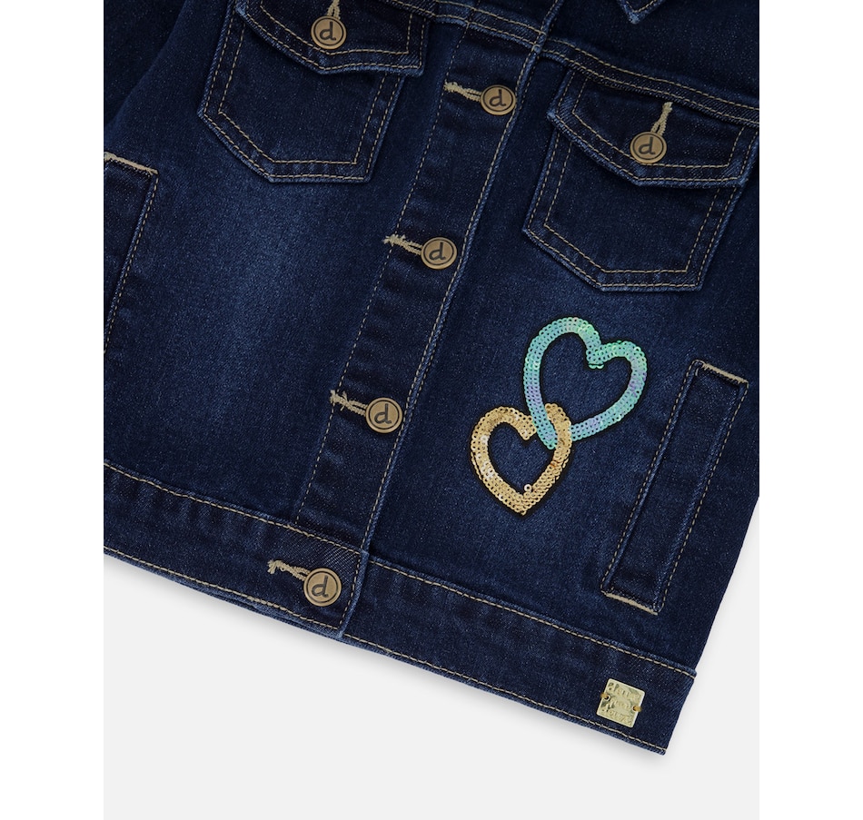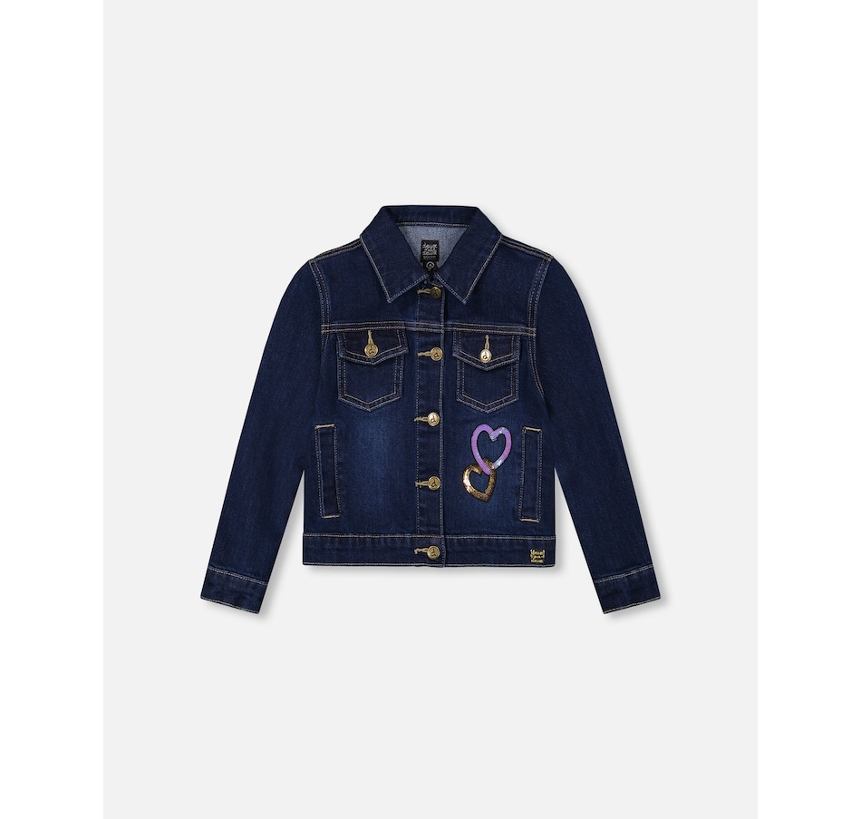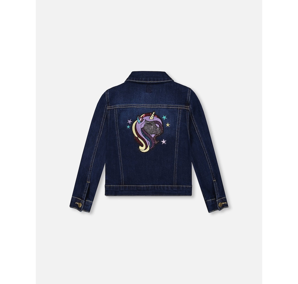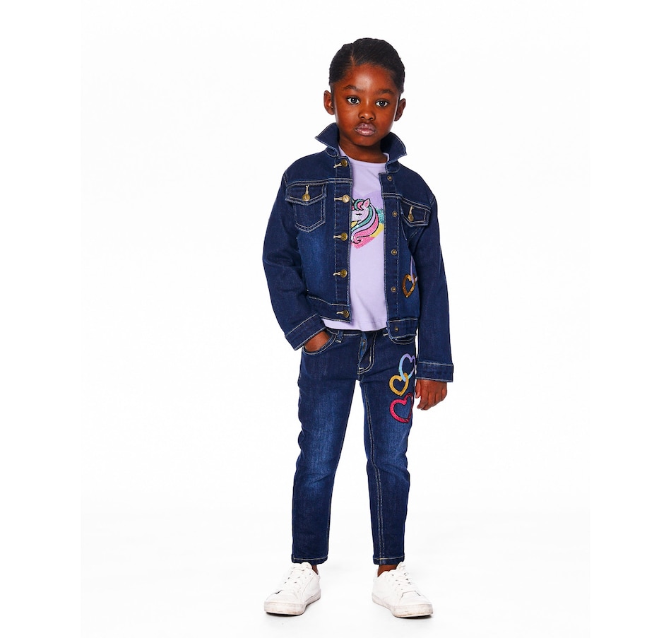 Our Stretch Denim Jacket Blue Denim With Glittery Hearts brings bold energy and fun flair to any fall outfit. This classic jean jacket is made from stretch denim and features glittery heart appliqués on the front, a sparkly unicorn appliqué on the back, a classic shirt collar, front flap pockets, metal buttons down the front, and visible contrast topstitching that highlights its structure. Pair it with a top or bottom from our “Let’s Dance!” collection for a dazzling everyday look.