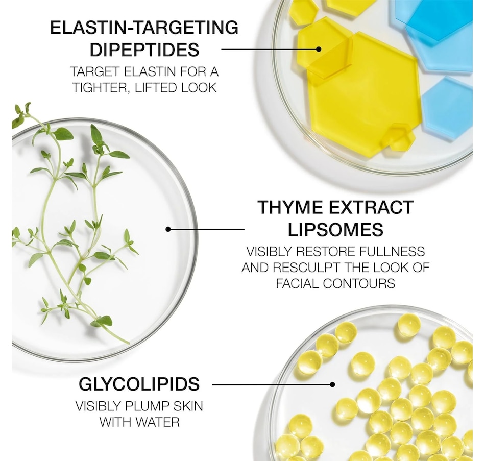 This cream is formulated with elastin-targeting peptides to address the appearance of loss of volume and sagging skin for a visibly lifted, firmer, plumper look.