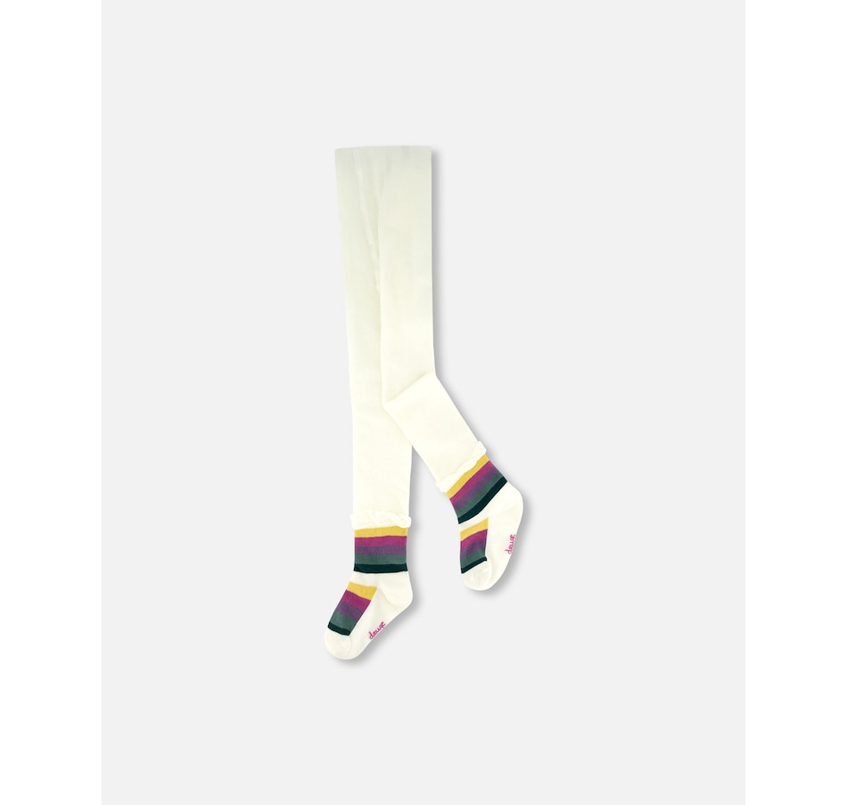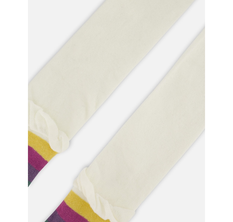 Add a playful twist to any outfit with our Striped Footed Knit Tights in Off-White. These girly tights are made from a soft cotton blend with stretch, featuring colorful horizontal stripes on the feet topped with a delicate ruffle trim, and a snug fit through the leg. Perfect for layering under dresses or skirts, they bring warmth, comfort, and charm all season long.