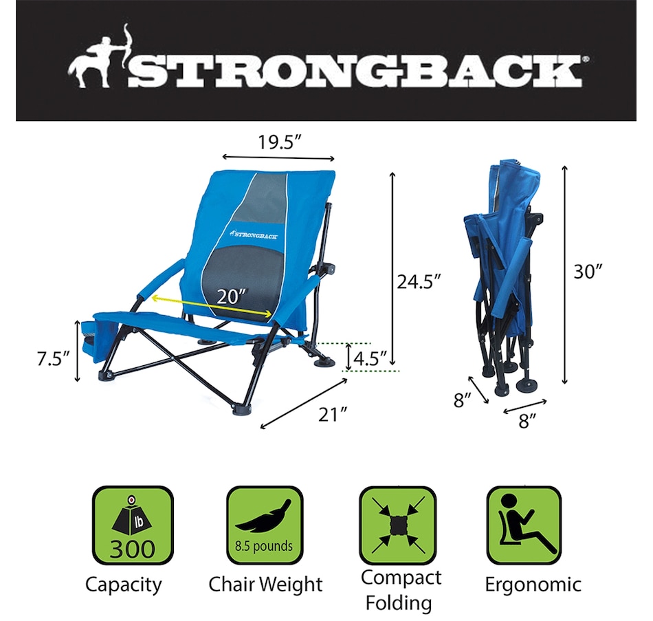 All Strongback folding camp chairs have an award-winning, patented ergonomic design built into the frame. The improved design better aligns your body posture to help ease tension, and offers lumbar support for your back and a special seat designed to prevent leg pinch and to help align the hips; system provides maximum comfort and relaxation