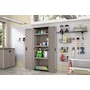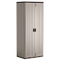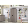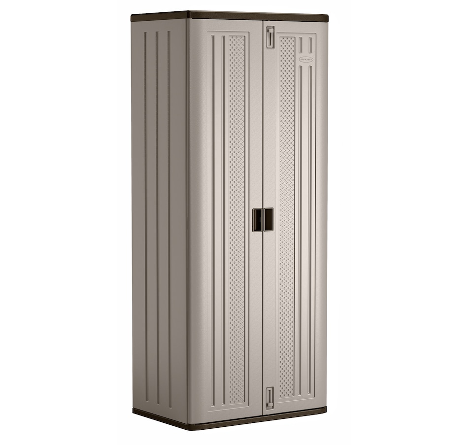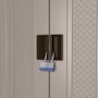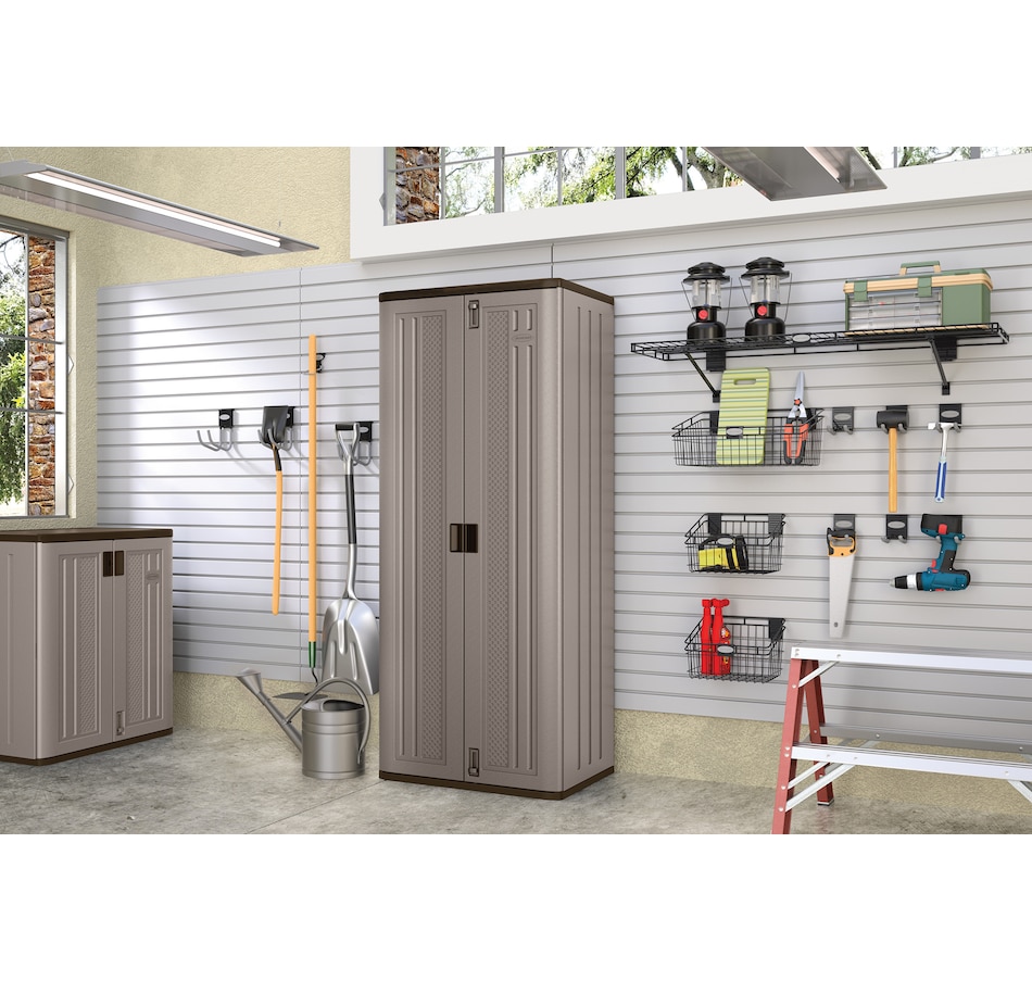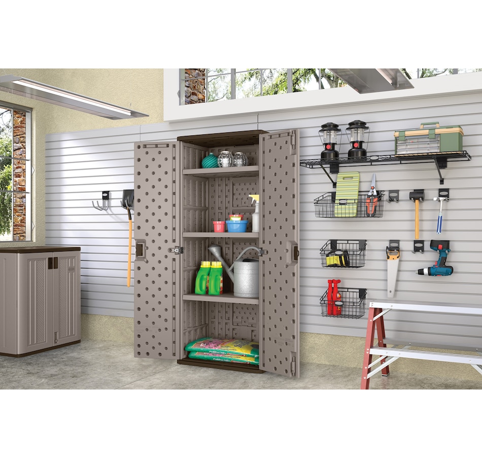 This tall storage cabinet by Suncast® shatters the notion that garage organization needs to be metal to be strong and stable. The multi-wall resin panels are engineered for added strength and durability, making it resistant to dents, rust, and rotting. Equipped with three adjustable reinforced shelves, each one capable of holding 75 pounds, this cabinet is the ideal storage solution for lawn gear, hand tools and more! With pad-lockable doors (lock not included) and an upper and lower latch to help keep doors closed, this cabinet will keep your items safe and secure. This low maintenance, easy to clean cabinet provides a storage solution that combines style and function to keep your garage organized and tidy!