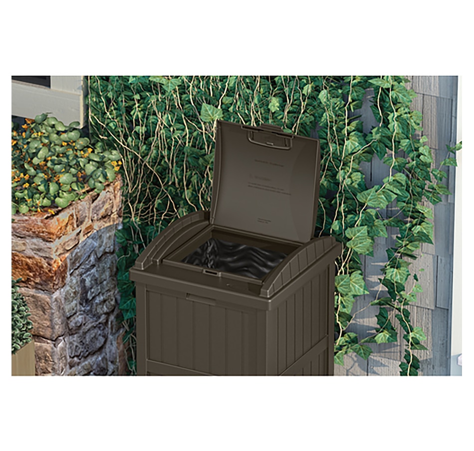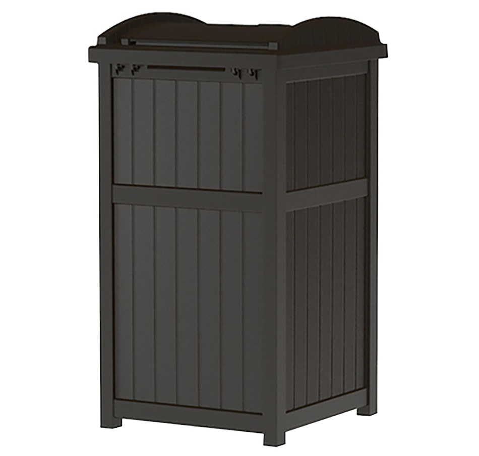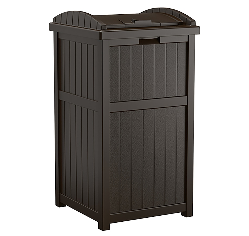 This Suncast Trash Hideaway has a stylish design that looks great on any patio or deck and will help keep your yard clean all year long. This unit uses standard 30 – 33 gallon trash liners and features a latching lid to keep your garbage in and unwanted critters out. Durable all-weather resin construction is easy to clean and maintain, while the solid bottom panel enhances product stability.