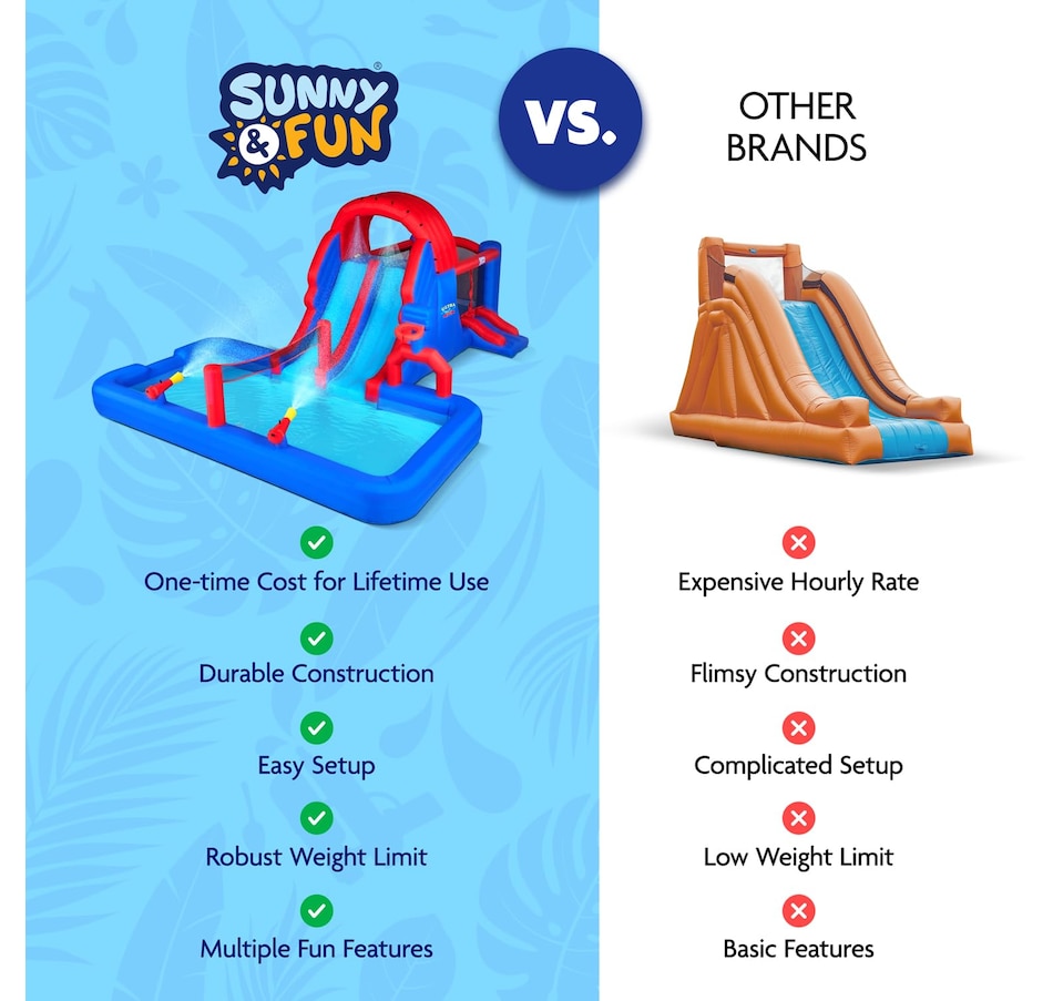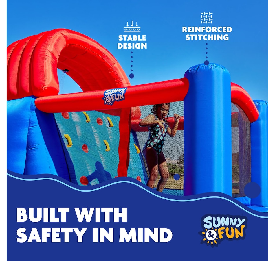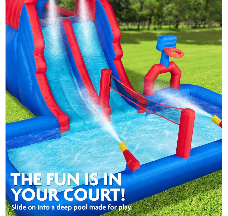 This inflatable waterslide for kids backyard has a soft bounce water slide, climbing wall, volley net and pool area. Kids will have loads of space to play on the blow up water slide. The bouncing house goes to the inflatable slide so they can zoom down the waterslide. Made with nylon, the kids water slide surfaces are built to last. Kids will be able to play and splash to their heart's delight in this inflatable pool with slide. With a better resistance and quality than other generic blow up water slides for backyard, Kids will enjoy this playset guaranteed. This water park for kids backyard is perfect for parties, birthdays, barbeques, and more. No need to go to the pool or beach when you can have an enjoyable, cool playset right at home. Everyday summer fun starts here with the inflatable water park & bounce house from Sunny & Fun.