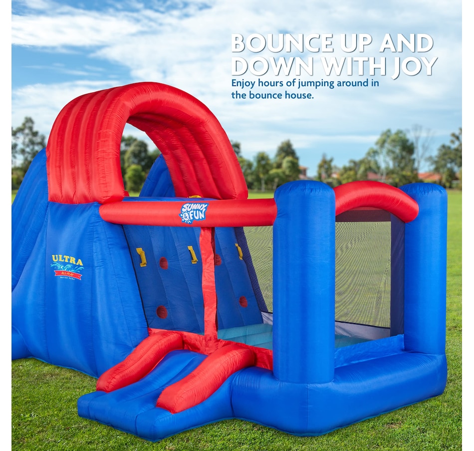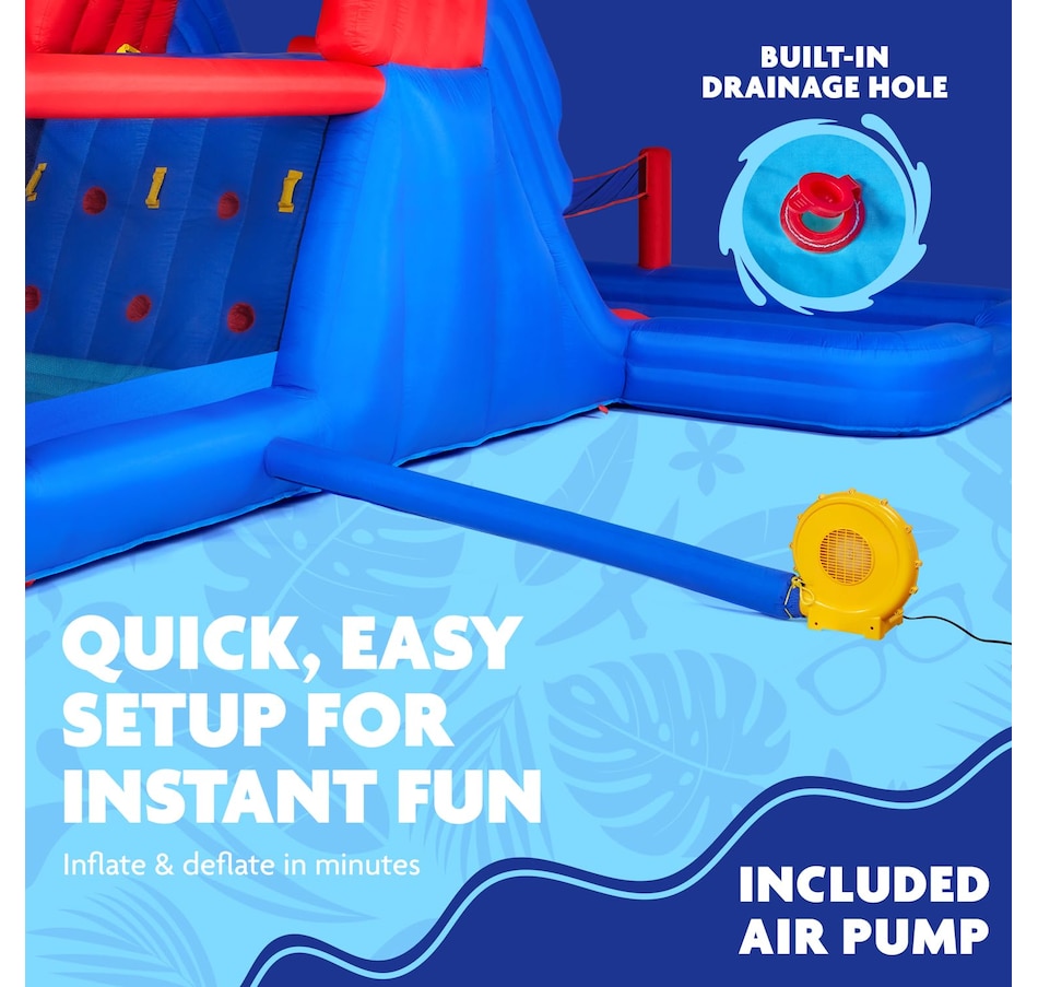 - Features include a bounce house, water slide, climbing wall, volley net and pool area