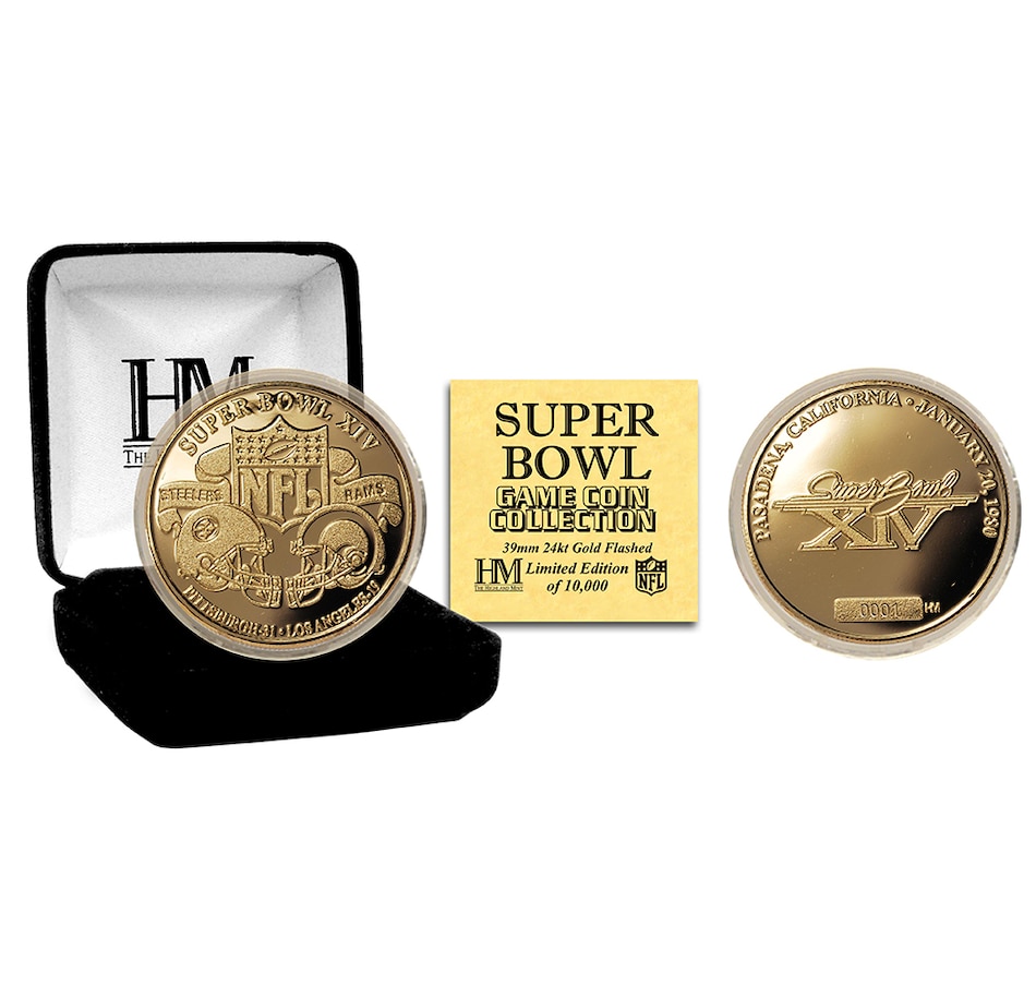 The reverse of the Flip Coin features the Official Super Bowl XIV logo with the location and date of the game listed on the perimeter. Furthermore, each coin is individually numbered, giving each coin its uniqueness! The coin measures 1.5” in diameter and each is protected in a capsule to preserve its condition and delivered in a 2.5" x 2.5" black velour collectors box with a Certificate of Authenticity. This unique Collectible is a limited edition of only 10,000 and it is Officially Licensed by the NFL. Proudly made in the USA by The Highland Mint!