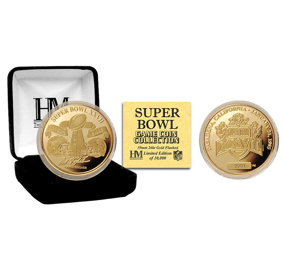 The game does not start without the “Flip Coin”! The Highland Mint is exclusively commissioned by the NFL to mint the 24KT Gold Super Bowl XXVII Game Coin! Each 24KT Gold flashed Super Bowl Flip Coin is a replica of the coin used for the Super Bowl "Coin Toss" and each is triple struck to the highest standards in minting tradition. This is the only coin licensed to feature the prestigious Vince Lombardi Trophy and it features the dueling helmets of the Super Bowl teams on either side!