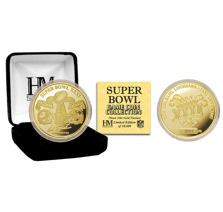 The reverse of the Flip Coin features the Official Super Bowl XXXI logo with the location and date of the game listed on the perimeter. Furthermore, each coin is individually numbered, giving each coin its uniqueness! The coin measures 1.5” in diameter and each is protected in a capsule to preserve its condition and delivered in a 2.5" x 2.5" black velour collectors box with a Certificate of Authenticity. This unique Collectible is a limited edition of only 10,000 and it is Officially Licensed by the NFL. Proudly made in the USA by The Highland Mint!