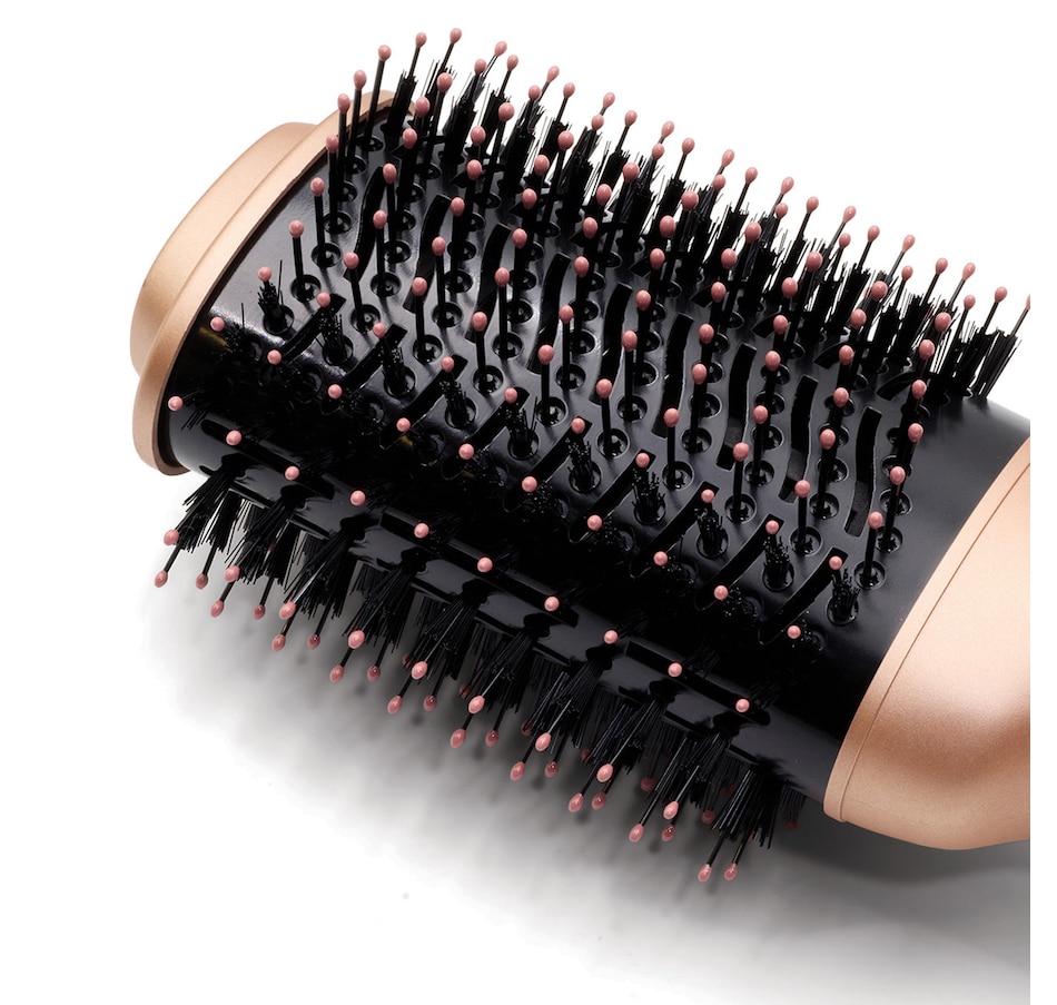 The tourmaline-infused ceramic barrel delivers an even heat distribution to rapidly dry with less damage, while a blend of premium bristles comb through damp or dry hair to detangle, smooth, and leave the hair shiny and frizz-free.