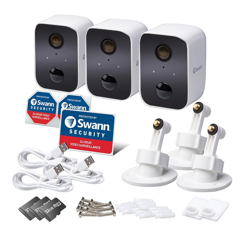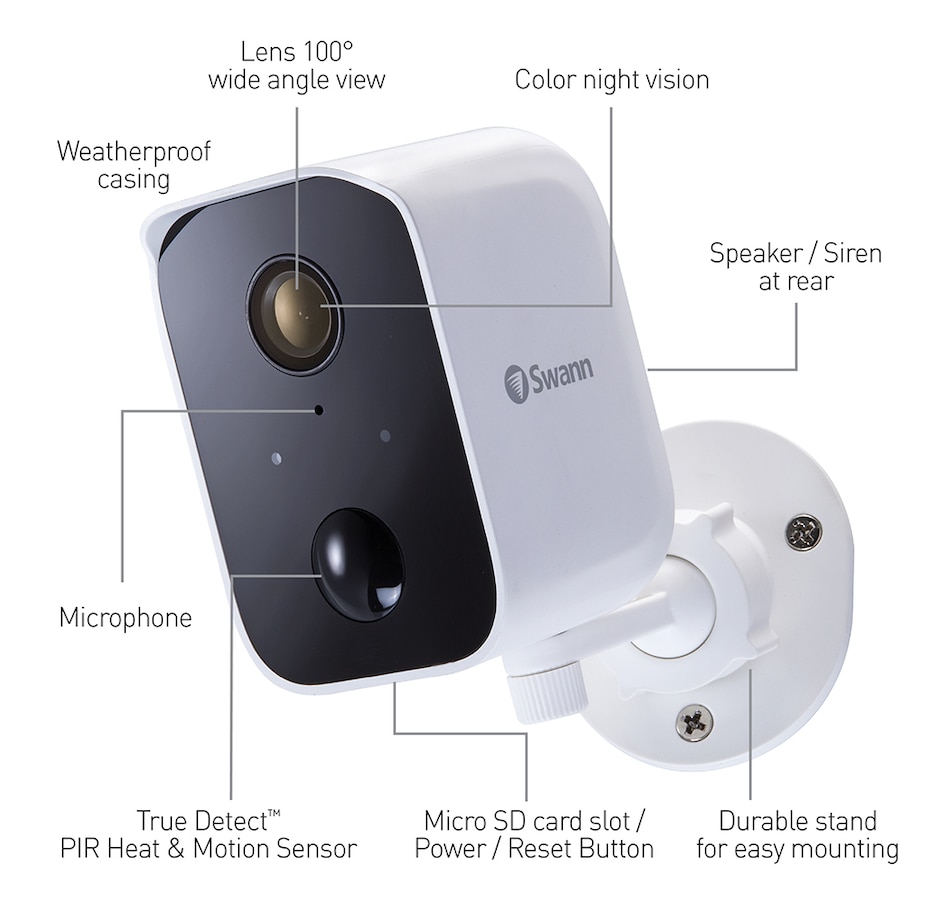 The CoreCam security camera is designed for people needing easy-to-install, completely wireless security set-up. It can operate for up to three months on a single battery charge and features stunning 1080p Full HD video in a compact modern design. Secure it with the screw-in mount to watch over any area, and from any angle. The weatherproof design is built to withstand rain, snow and heat, and see in the dark up to 26 feet, with powerful infrared night vision that kicks in automatically! The two-way audio feature allows you to have a presence at your home, giving you peace of mind while you’re away; you can even scare off intruders by activating the siren from your phone! Swann’s True Detect heat and motion detection triggers video recording and push notifications straight to you. Use voice commands with Alexa and Hey Google to see what’s happening hands-free! CoreCam also has free storage allowing you to store thousands of clips onto the included 32GB Micro SD card.