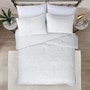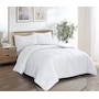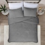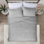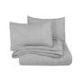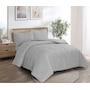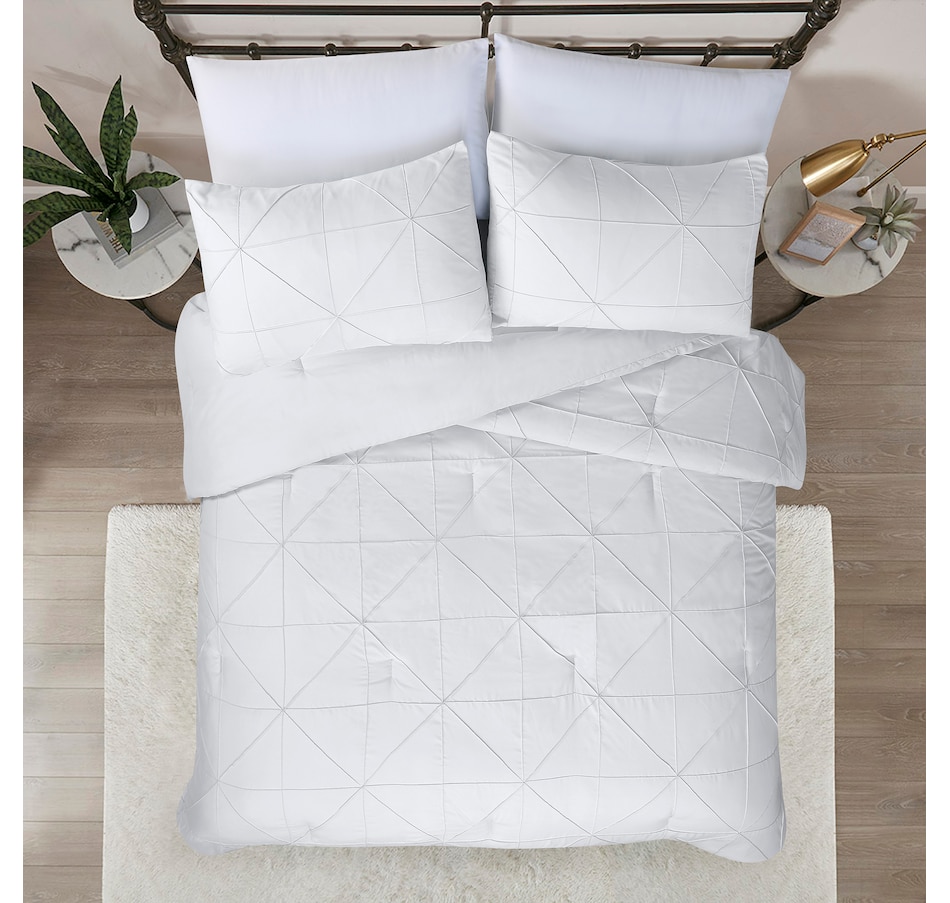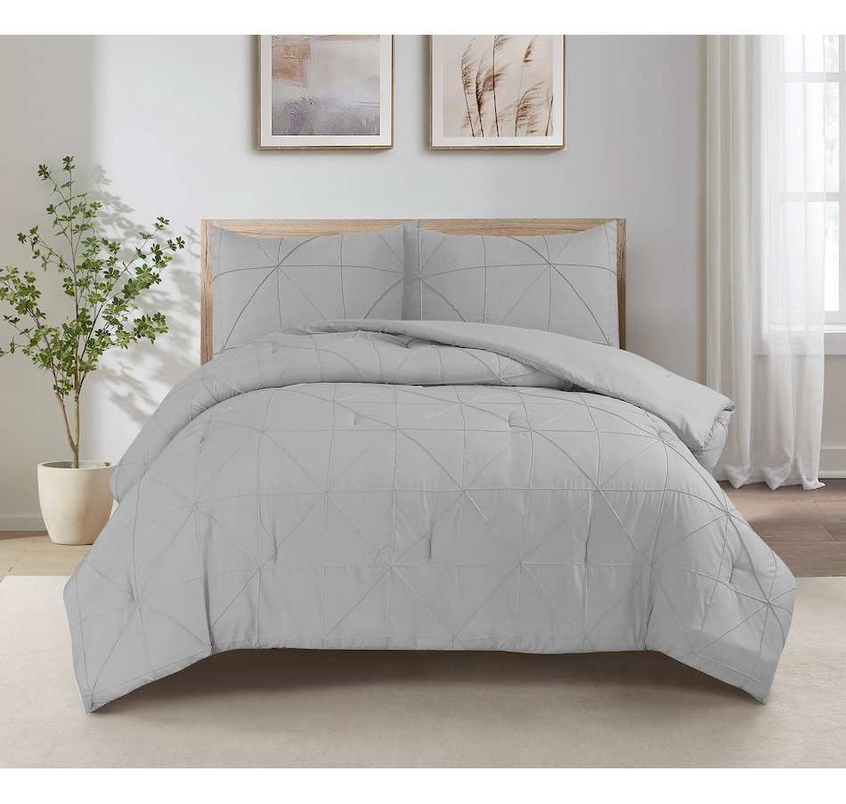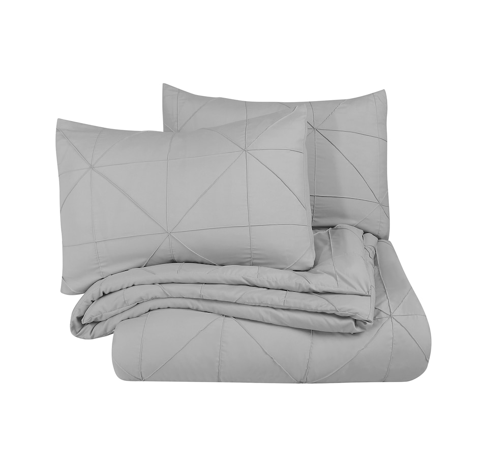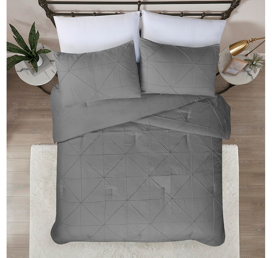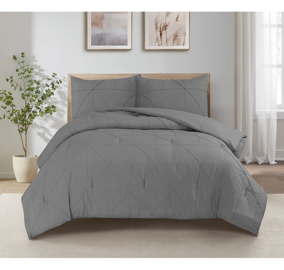 Enhance your bedroom's aesthetic with the Geo pinch pleat comforter set, featuring a sophisticated grid pattern. Crafted from an ultra-soft microfibre, this comforter offers versatility for various styling options and year-round comfort. The chic design blends refined pinch pleats with a contemporary grid motif, adding depth and dimension to your space. Filled with premium polyester, it strikes the perfect balance between weight and warmth, making for coziness throughout all seasons. The microfibre fabric not only provides exceptional softness but also boasts durability and wrinkle resistance.