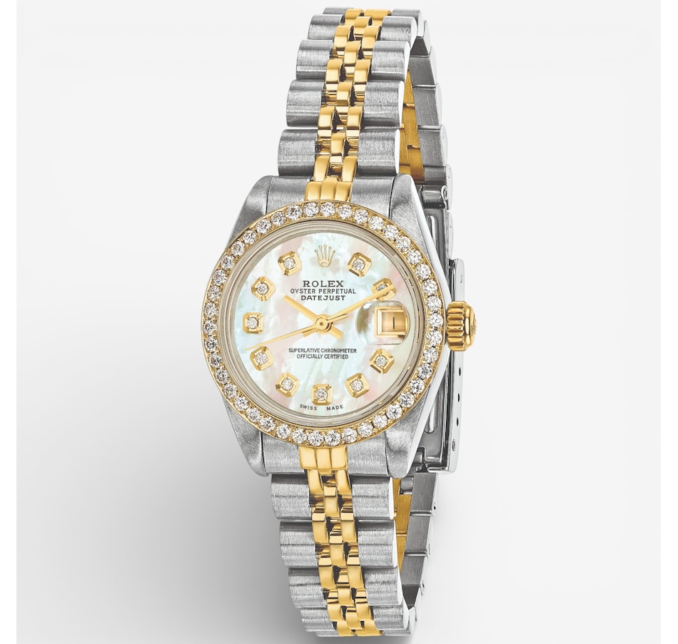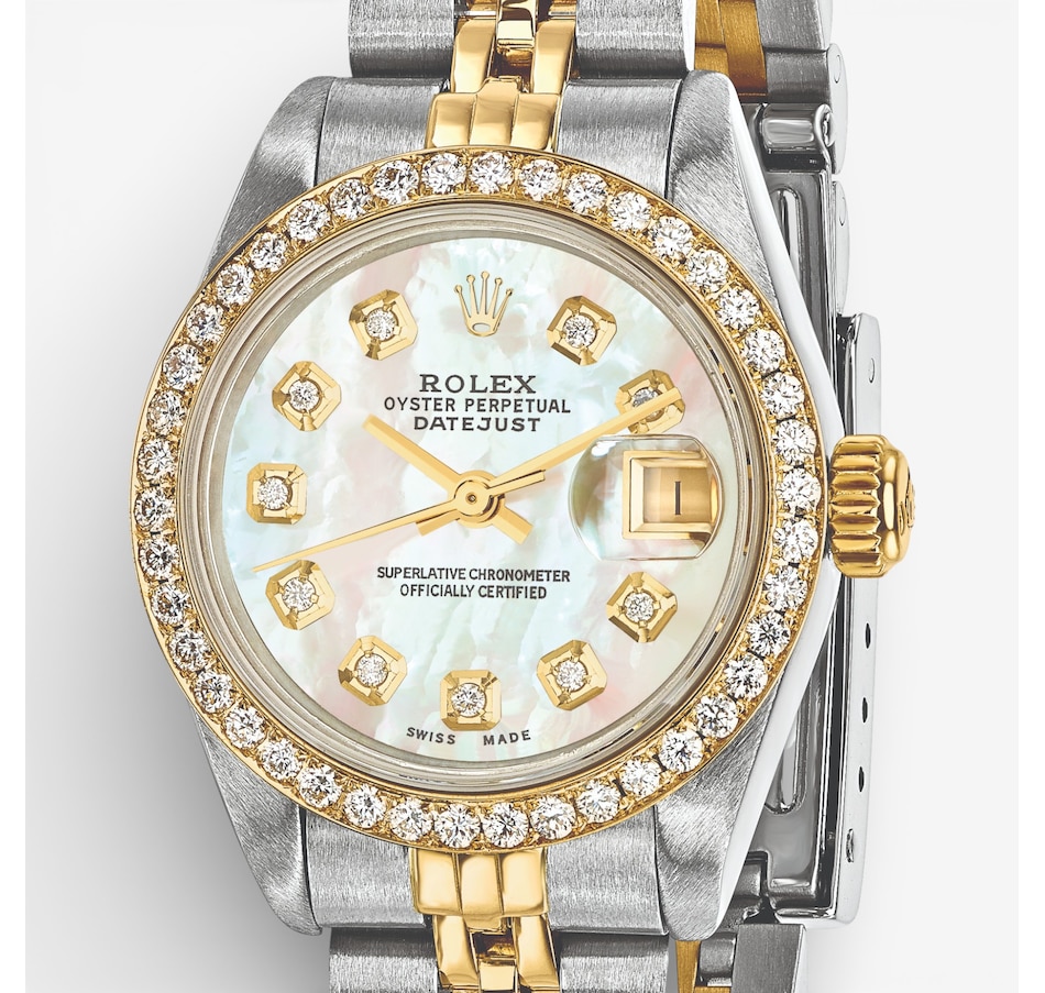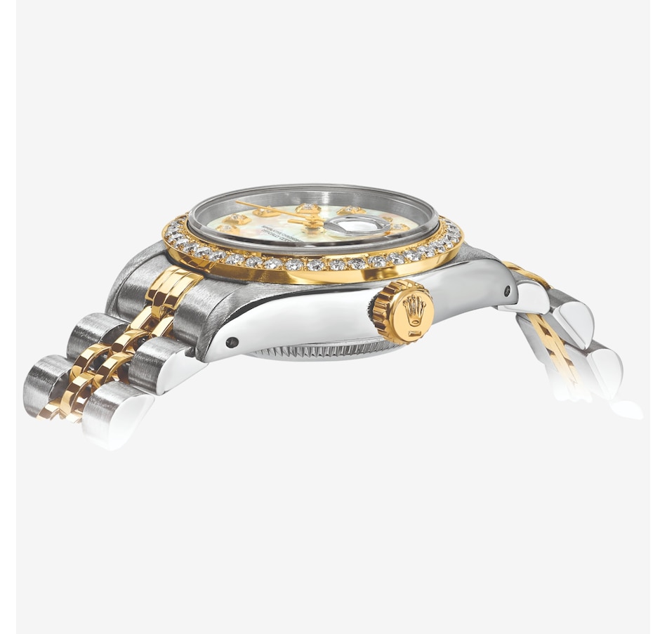Elegance shines with romantic brilliance in this independently certified Swiss Crown pre‑owned Rolex Datejust watch. The iridescent mother‑of‑pearl diamond dial shimmers beneath a sparkling diamond‑set bezel, pairing effortlessly with the two‑tone Jubilee bracelet for a look that feels instantly elevated. Powered by Rolex’s signature automatic movement, it offers smooth, dependable performance with no battery required—a breathtaking blend of artistry and prestige.