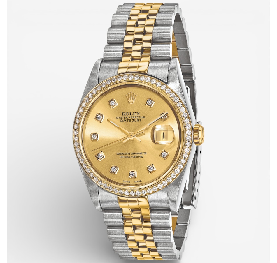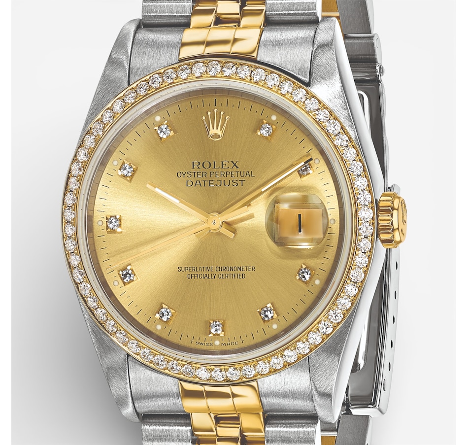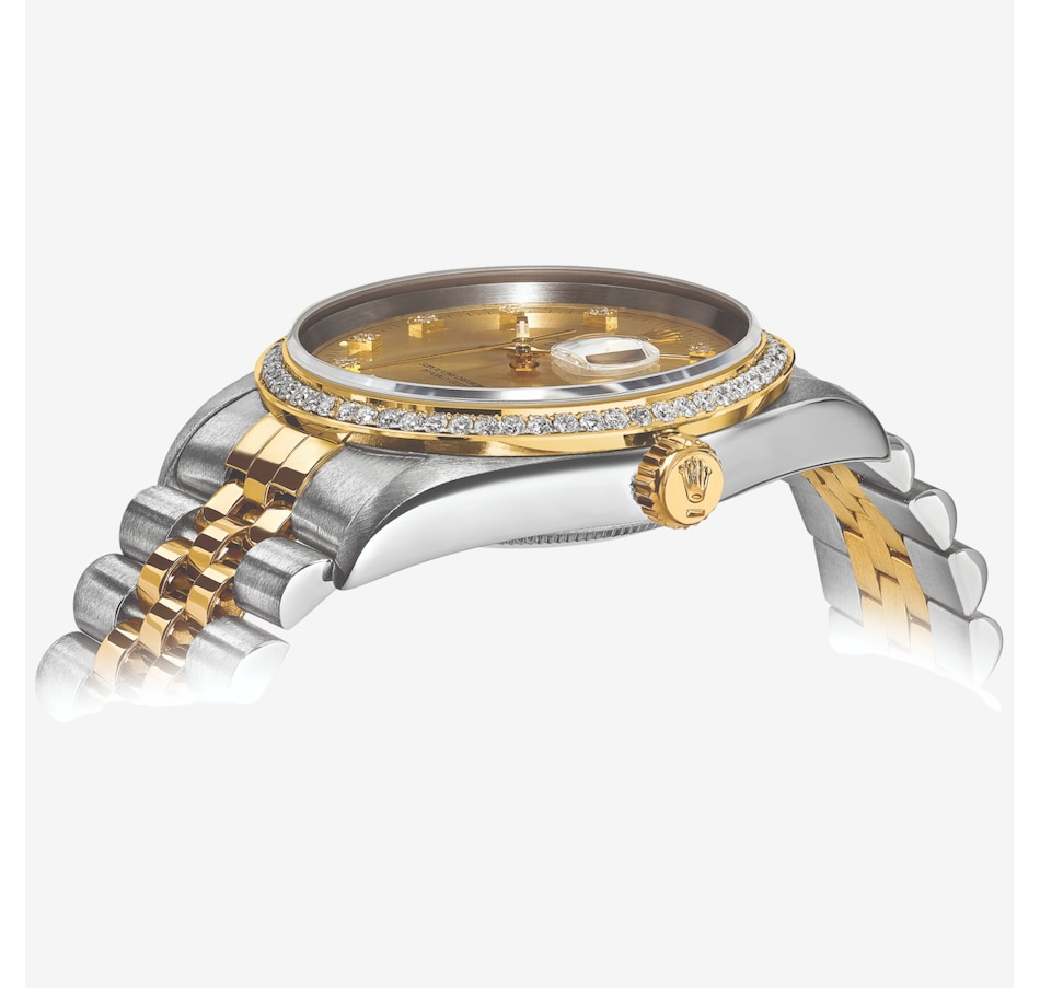 Crafted with stainless steel and 18K yellow gold, this independently certified Swiss Crown pre‑owned Rolex Datejust watch highlights the richness of its materials. The champagne diamond dial glows warmly, complemented by a full diamond bezel for added brilliance, and the Jubilee bracelet provides comfort and a classic finish. Restored to pristine condition, this 36‑mm automatic watch showcases luxurious textures and Swiss precision.