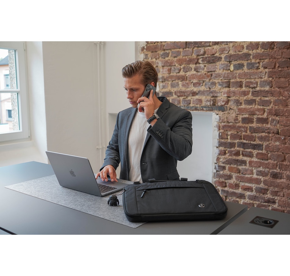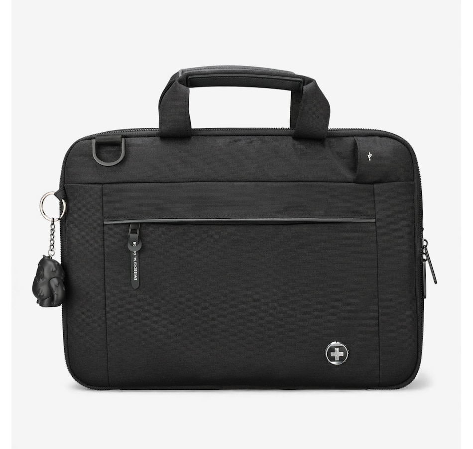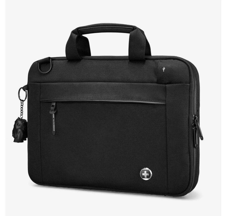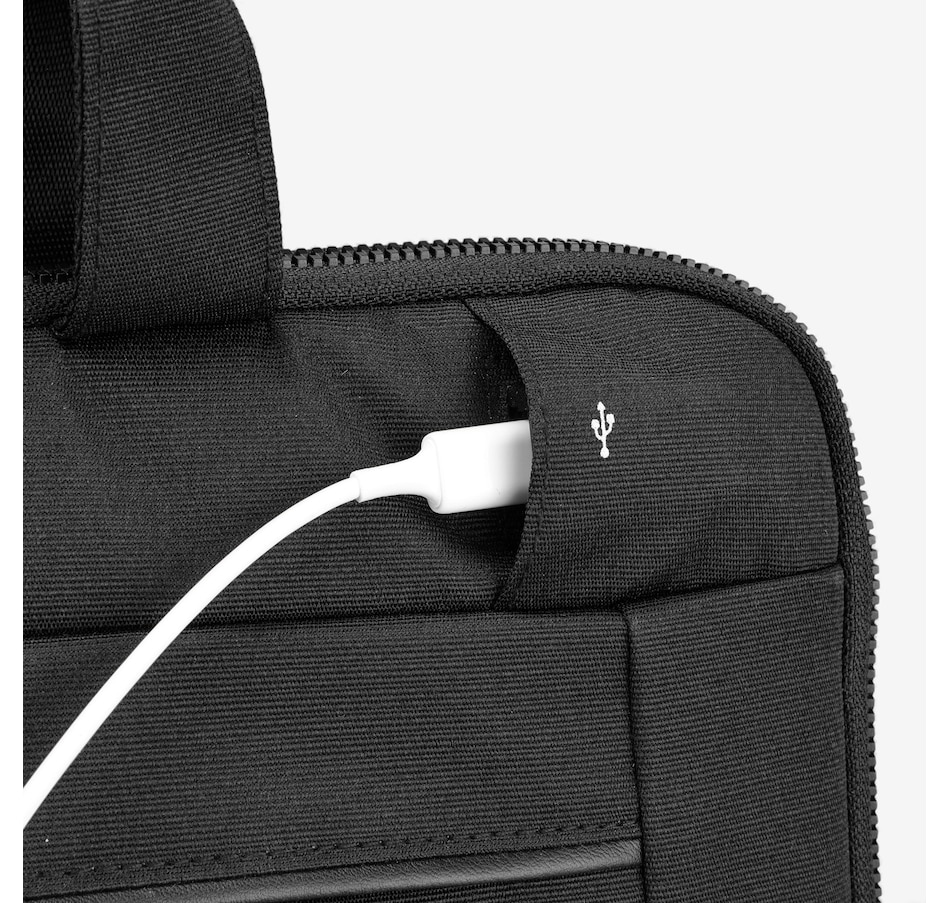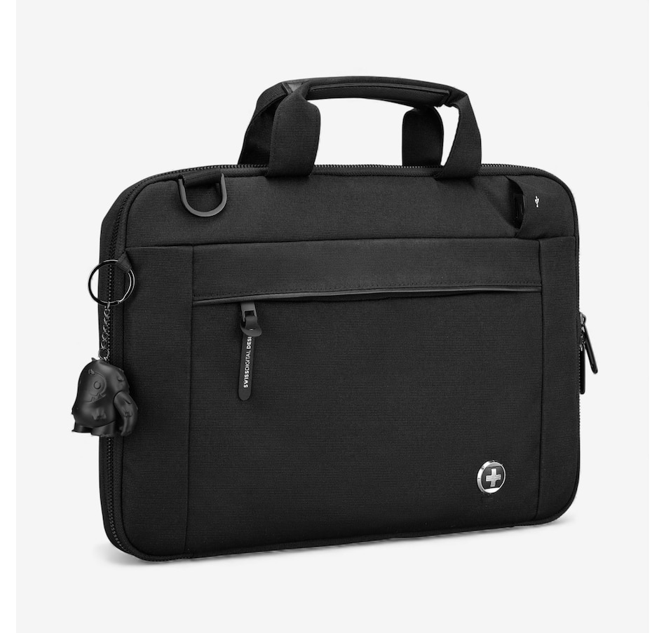 This stylish 16-inch black laptop sleeve from Swiss Digital is perfect for students and professionals, and features water-repellent fabric and an integrated USB charging port.