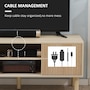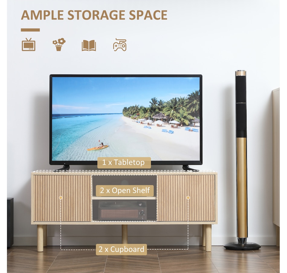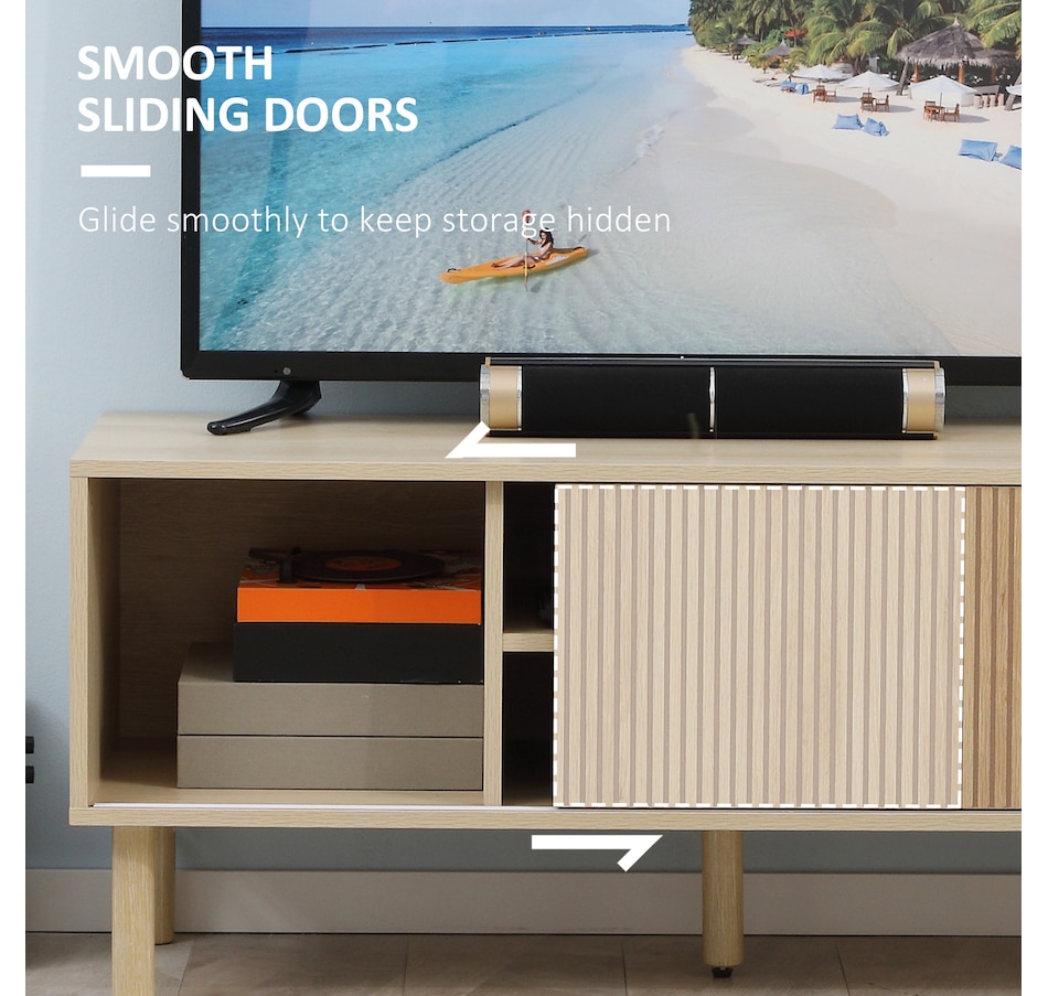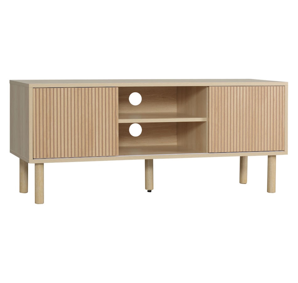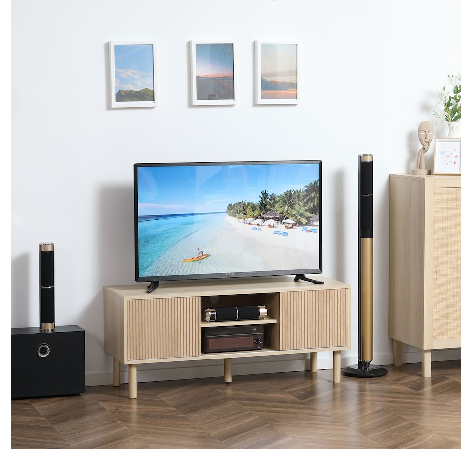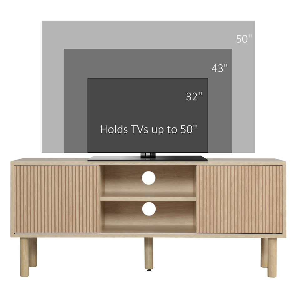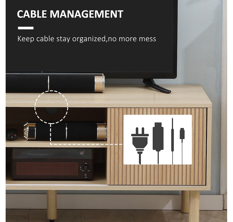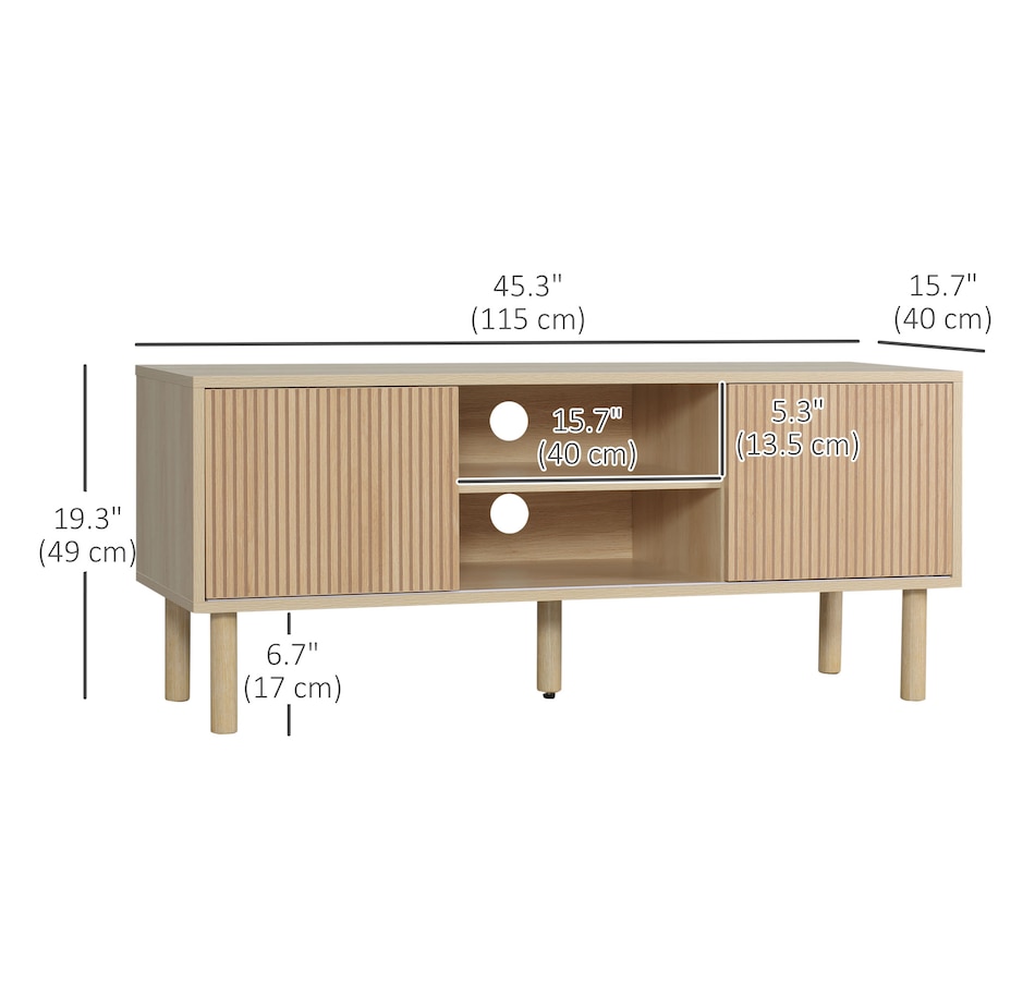 Create a stylish and modern centerpiece with this current entertainment center in your living room. The elegant and natural appearance will match any style of furniture. A large tabletop, two open shelves, and two door cabinets provide plenty of storage room for your electronics, accessories, magazines, books, and DVDs. Two cable holes on the back keep wires organized and tidy in your home. Enjoy your relaxing time with this HOMCOM media console!Features: