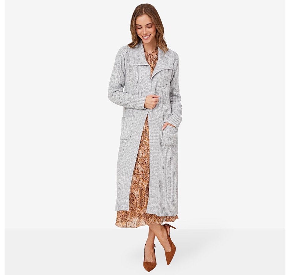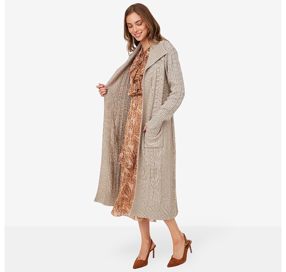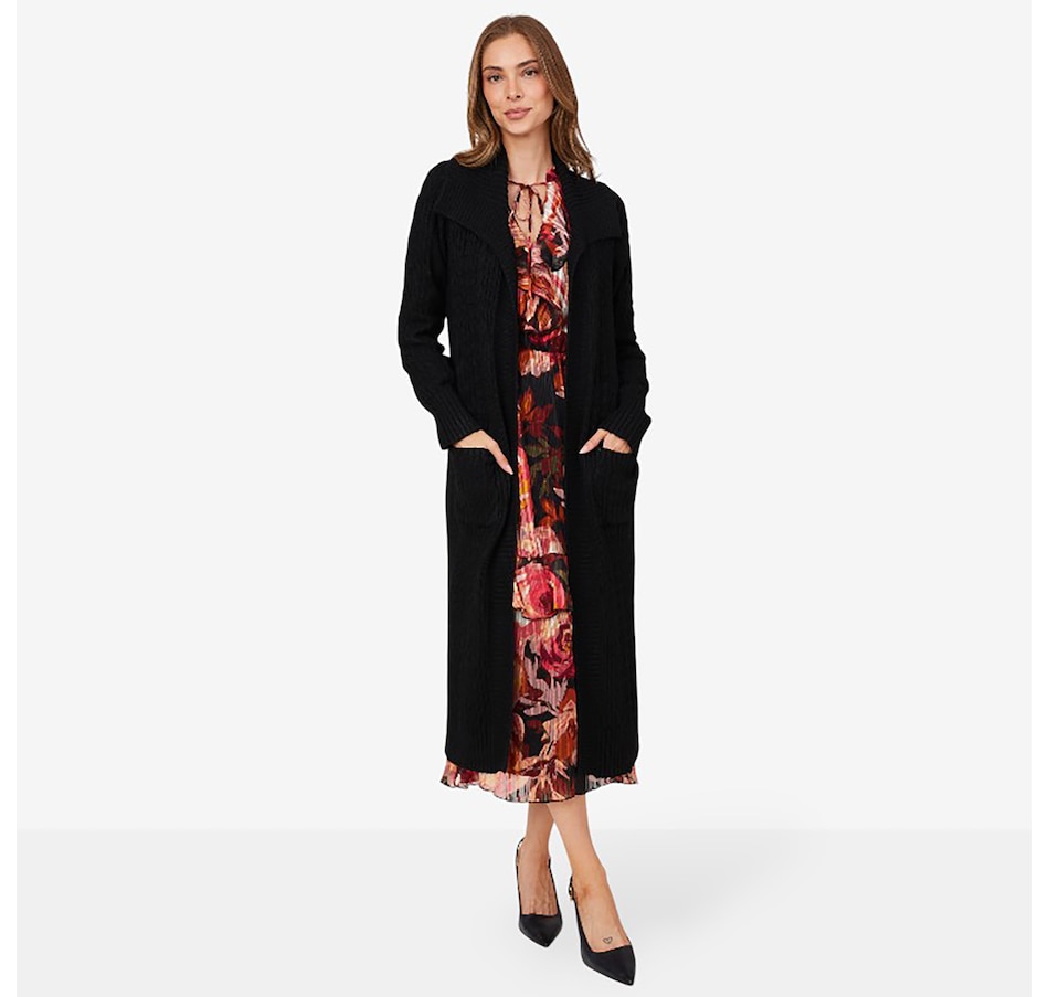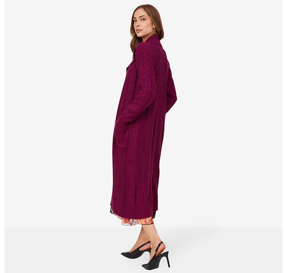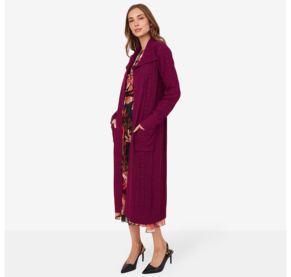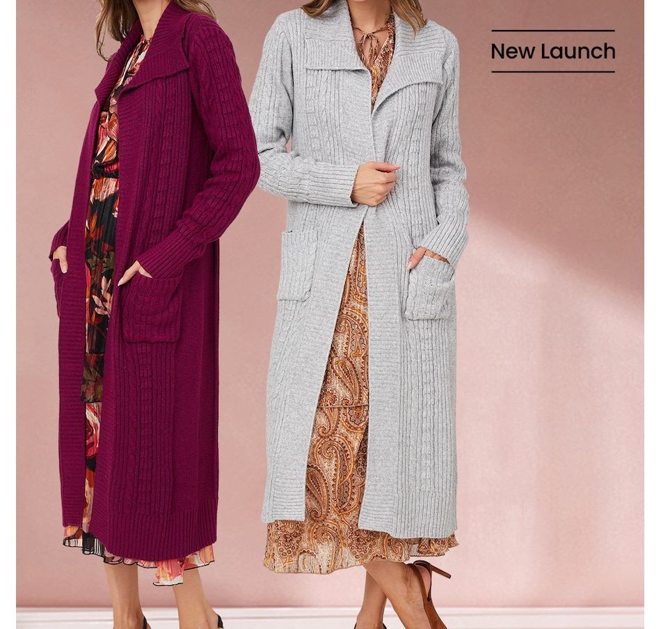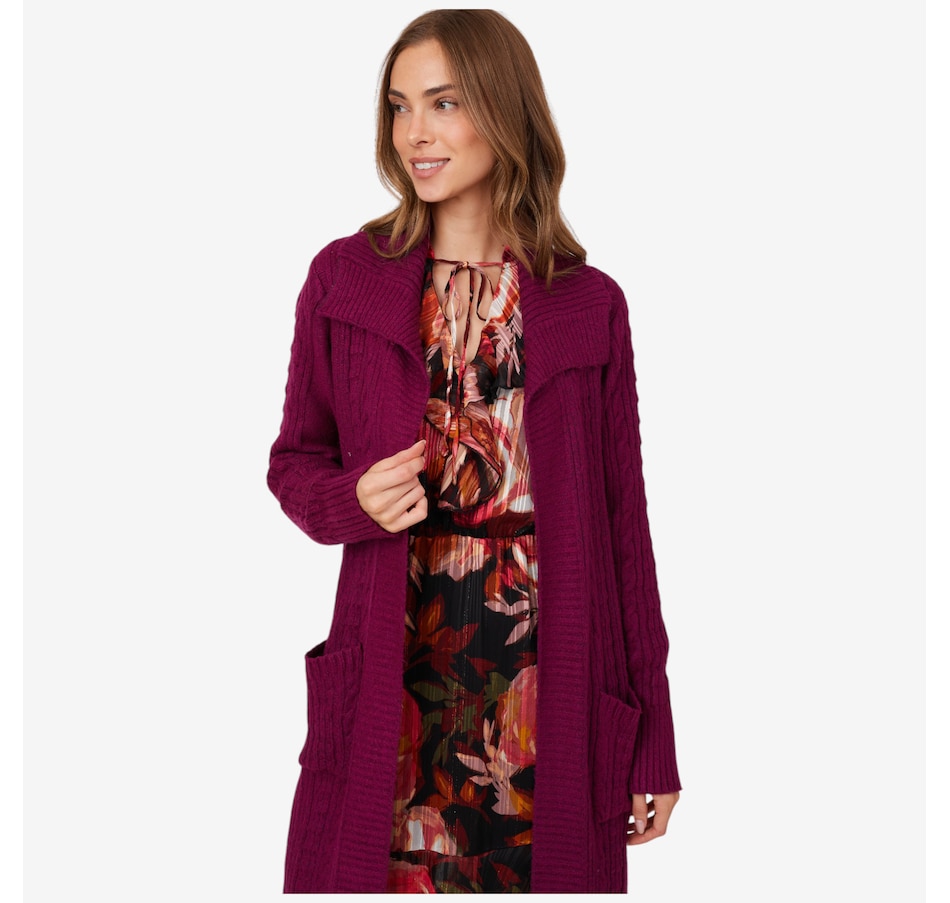 This Christie Brinkley long sleeve cable open cardigan features patch pockets and rib trims at the bottom opening, sleeve opening, cuffs, front panels and wide collar. It is available in a range of fabulous colours, and at a fantastic showstopper price, right here at TSC!