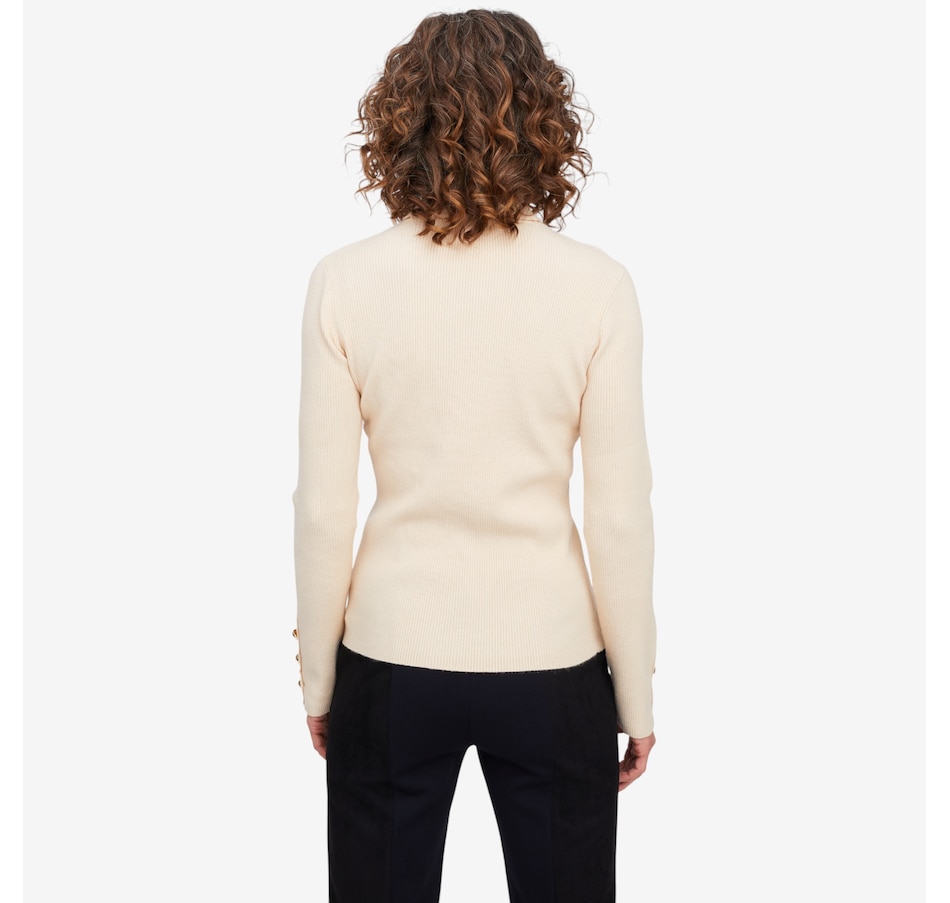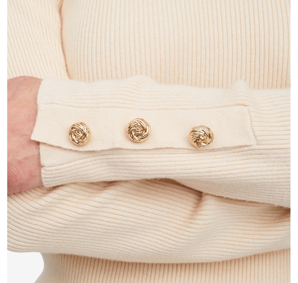 This knot button ribbed sweater from TWRHLL is designed with a classic turtleneck, and features functional gold buttons at the placket and sleeves. It comes available in two great colours, and makes a fabulous centering piece for virtually any look.