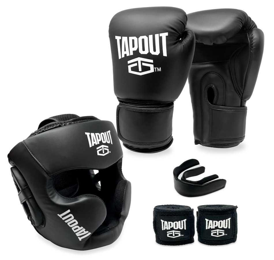 This six-piece boxing kit from Tapout is the ultimate boxing set for beginners and enthusiasts alike, and includes everything you need to get started and stay protected during your training sessions. The set features a pair of 10-ounce boxing gloves to provide optimal comfort and support for your hands. These gloves are designed to absorb impact and deliver powerful punches without compromising on safety. To ensure maximum protection, the kit also includes protective headgear that shields your head from any potential impacts. This headgear is adjustable to provide a secure and comfortable fit. Additionally, the kit includes two pieces of handwraps, which offer extra support to your wrists and hands, to help reduce the risk of injuries during intense training sessions. The handwraps are made from durable materials to withstand regular use. This kit also features with a mouth guard to help safeguard your teeth and jaws. The mouth guard provides excellent protection against impact, and can help ensure your oral health remains intact.