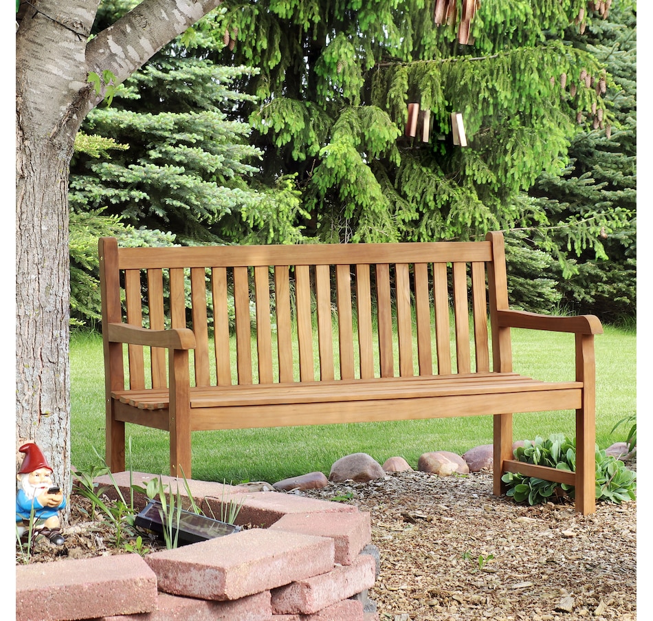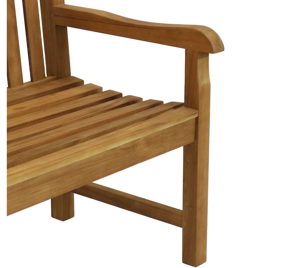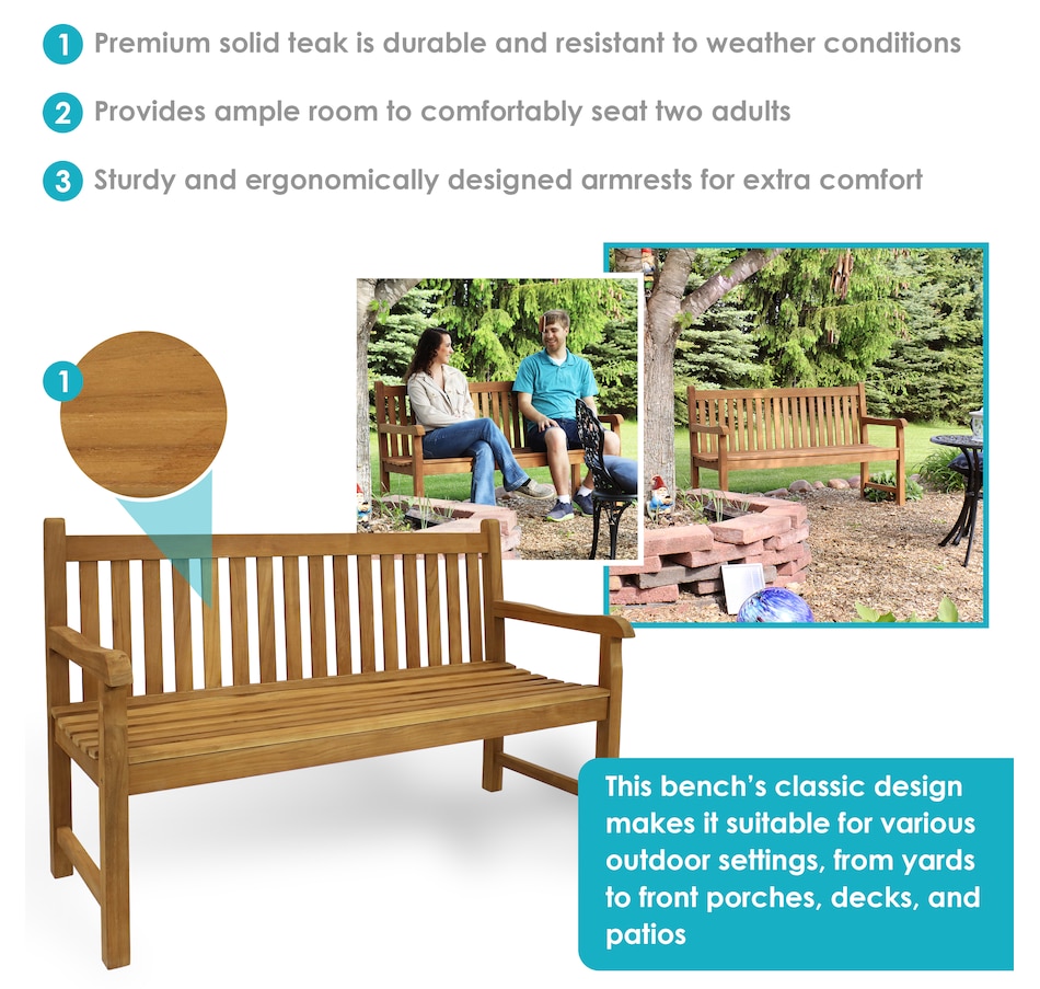 This classic teak outdoor wooden bench blends timeless design with dependable craftsmanship to create a charming and functional addition to any outdoor space. The outdoor park bench offers a generous yet space-efficient footprint that comfortably seats 2 adults. Crafted from sustainably sourced teak wood, it features a smooth finish that highlights the wood’s natural beauty and rich golden tones. Teak’s durability and resistance to weather make it an excellent choice for outdoor use, whether placed on a patio, nestled in a garden, or set on a front porch. The design adds decorative appeal while maintaining a clean, classic silhouette. Galvanized hardware enhances the structure’s strength and ensures long-lasting stability, even in changing weather conditions. With a 675 lb weight capacity, this bench delivers both comfort and reliability, making it a standout piece among benches for outside spaces, whether in use or simply enhancing the scenery.