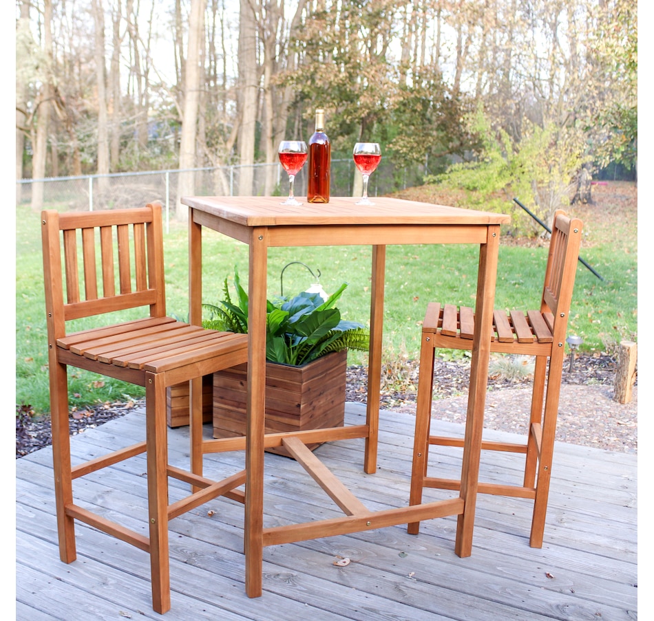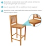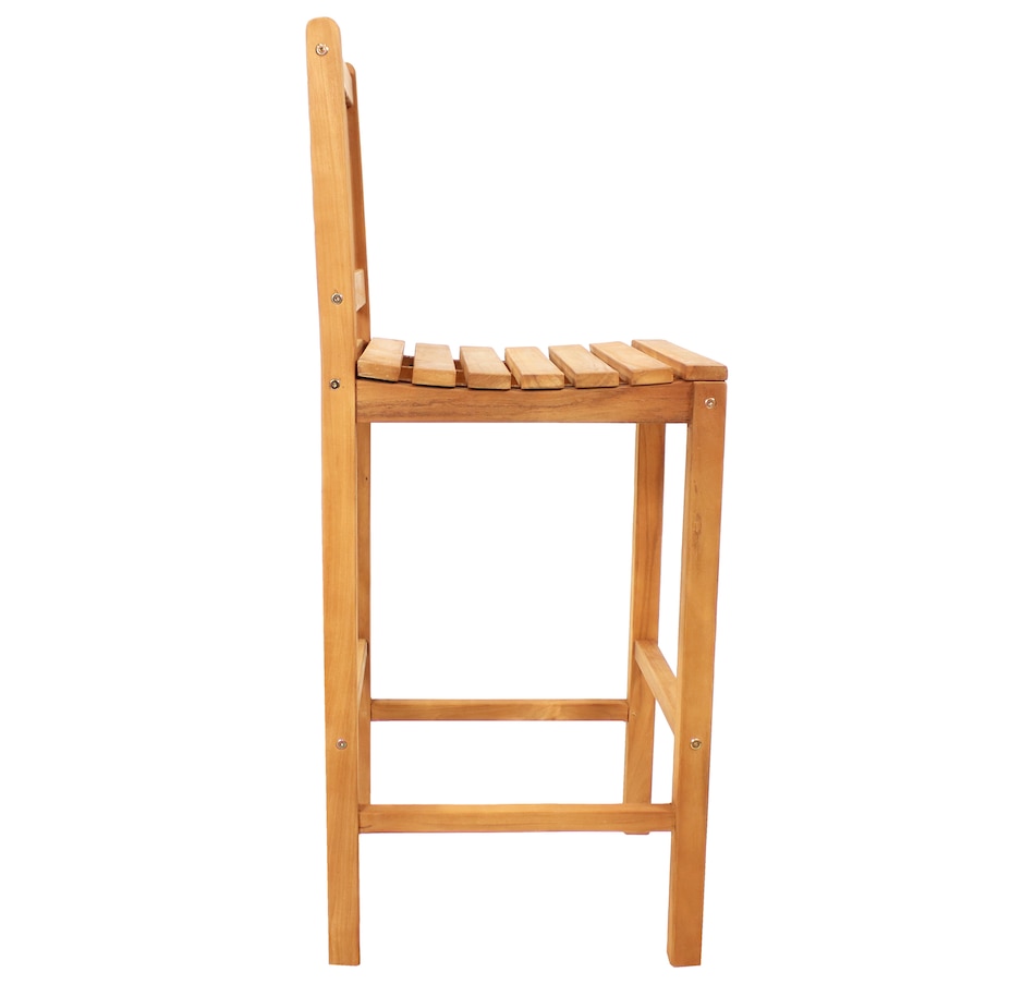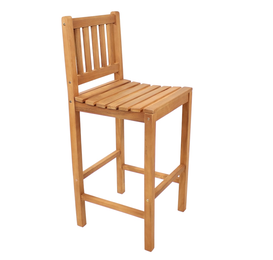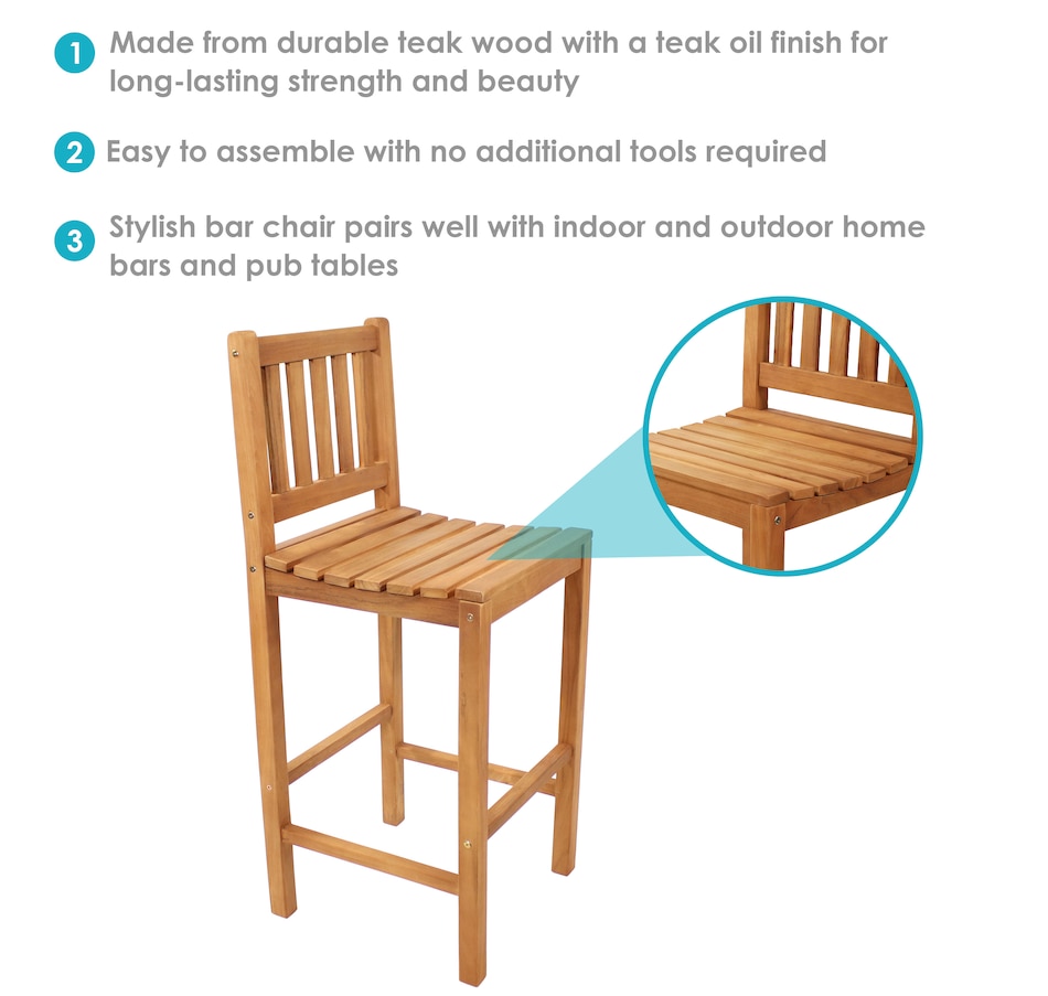 Enjoy drinks on the patio on a warm sunny day with this simple yet sophisticated patio barstool. Made from sturdy teak wood with an elegant teak oil finish, this chair features a classic design that will complement any backyard, deck, or patio bar. It can also be a stylish addition to any sunroom or basement bar. Plus, it will blend seamlessly with a variety of modern patio furniture types and decor styles. With extra height and a comfortable footrest bar, it will pair well with a patio bar or a tall bar table. The chair is sturdily built to resist the outdoor elements and look great season after season. This chair has a weight capacity of 330 lbs. This chair is easy to put together. All of the tools and hardware necessary for assembly are included. Cover the chair or bring indoors when not in use to extend the product life.