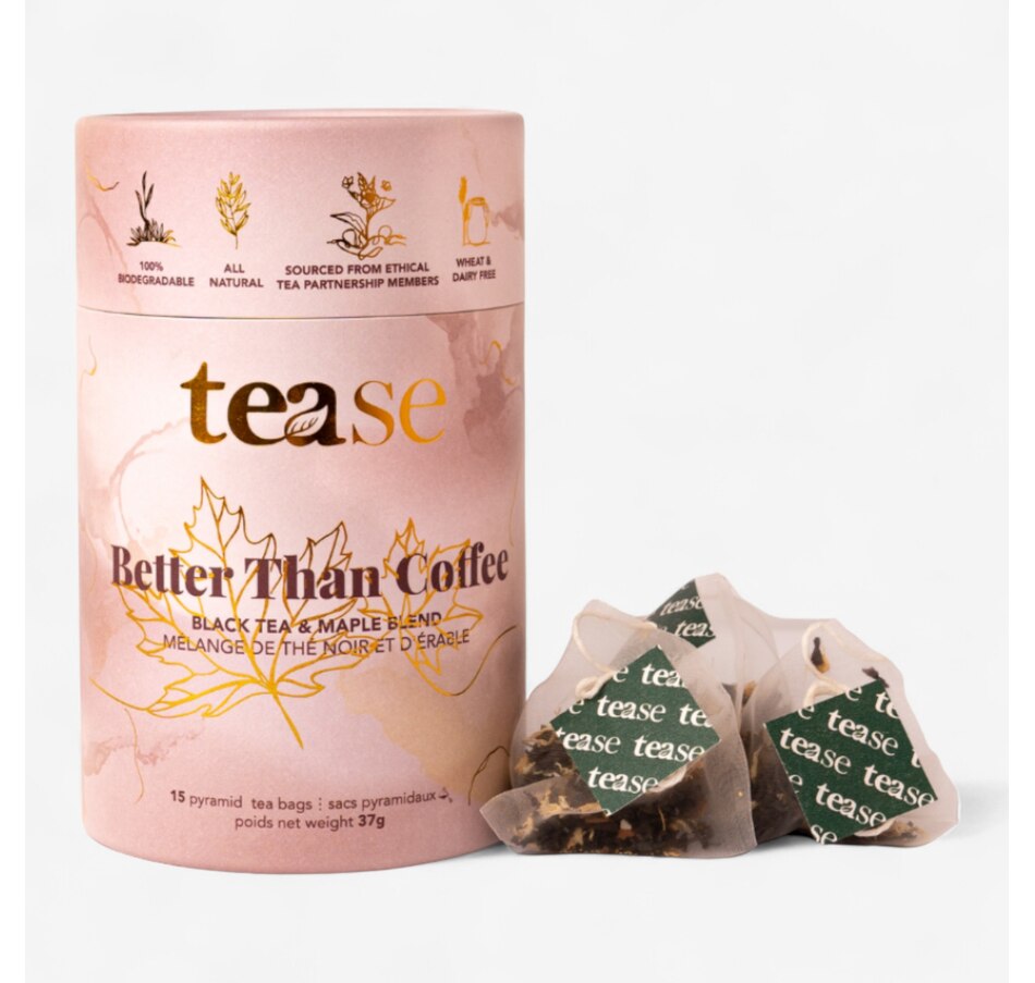 Better Than Coffee is a, caffeine-containing wellness tea designed to fuel energy and focus without the jitters of traditional coffee. Bold black tea combined with sweet maple, apple, and a touch of grapefruit creates a cozy, invigorating cup to start your morning with intention.