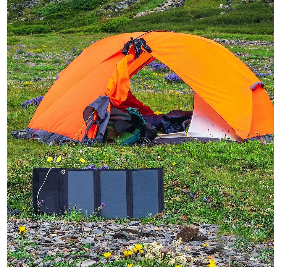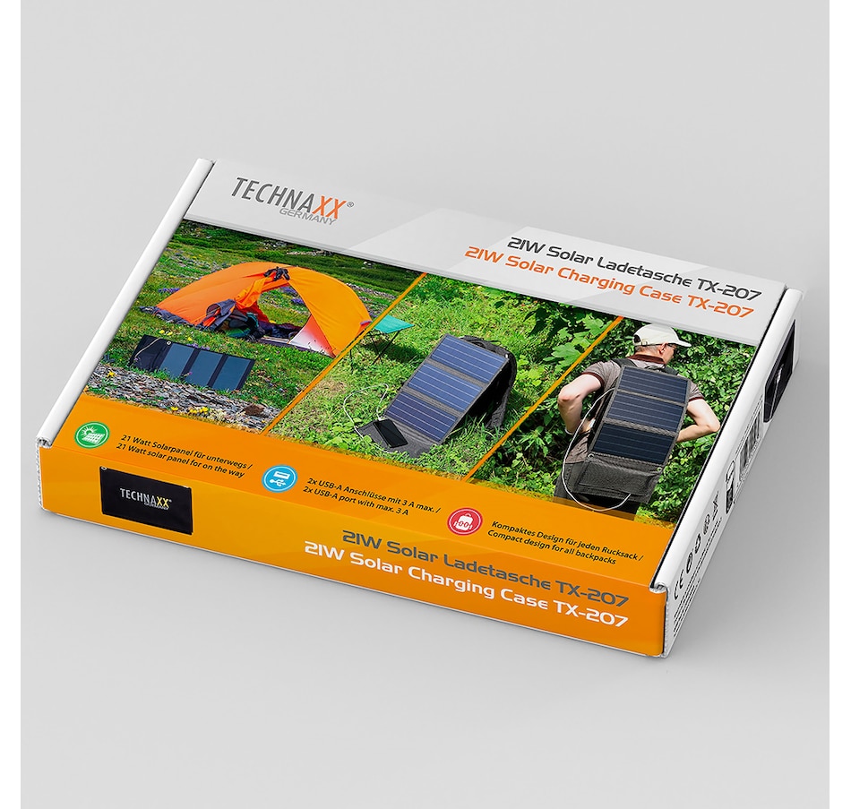 This solar charger is manufactured for camping trips or for travelling to areas without a power supply. The TX-207 can easily fit into a backpack so you can use the solar panel on the go and charge your devices anywhere. The TX-207 converts up to 19 percent of solar energy into energy with sufficient sunlight. Put it in a bright place with long exposure to sunlight, and here's a tip: you'll get the best performance when the sun hits the panel at a 90-degree angle.
