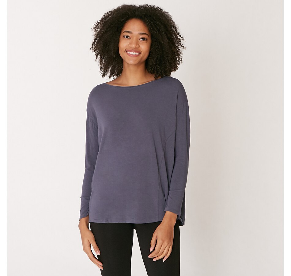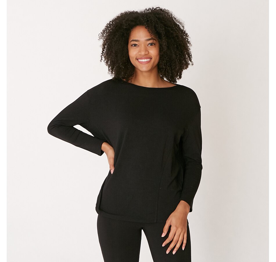 • Long sleeve, pull-on, relaxed, cocoon top, relaxed fit, high-low hem , bum-covering length