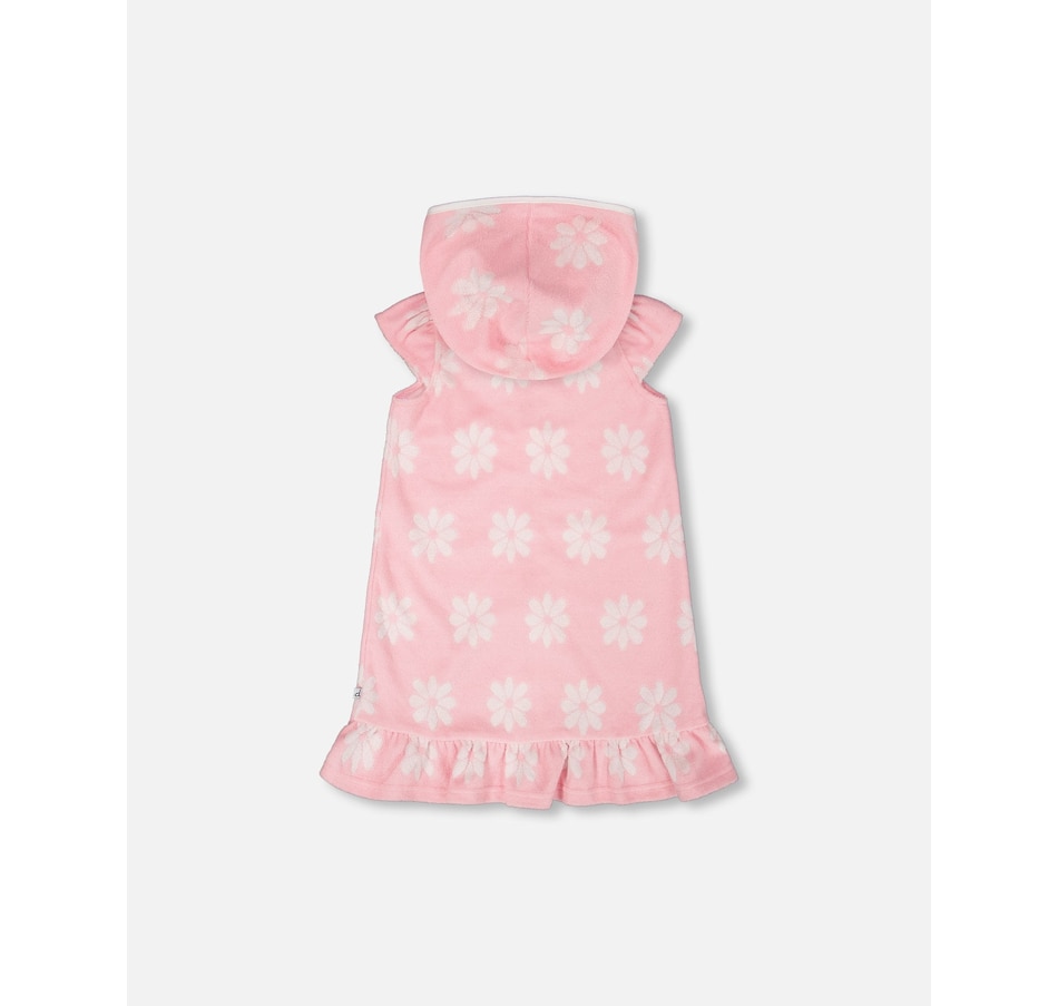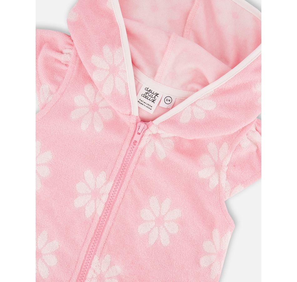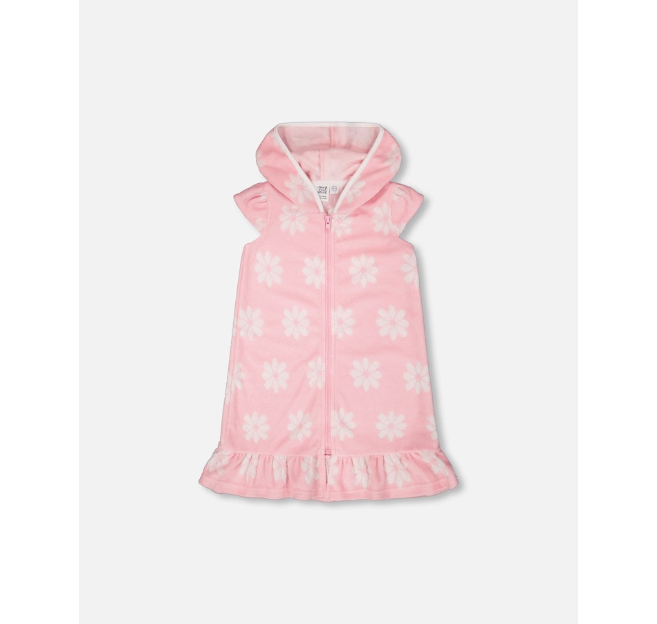 Soft and practical, this terry cloth beach hoodie dress in pink with printed flowers is made for sunny days by the water. This dress features a full-length zipper at the front, a cozy hood, and cap sleeves for easy layering. The bottom ruffle adds movement and charm, while the floral terry cloth fabric ensures comfort after a swim.