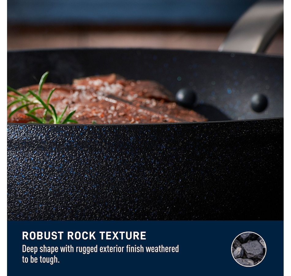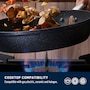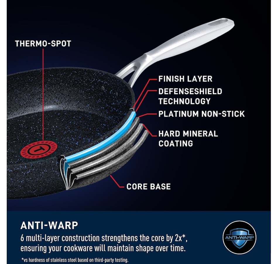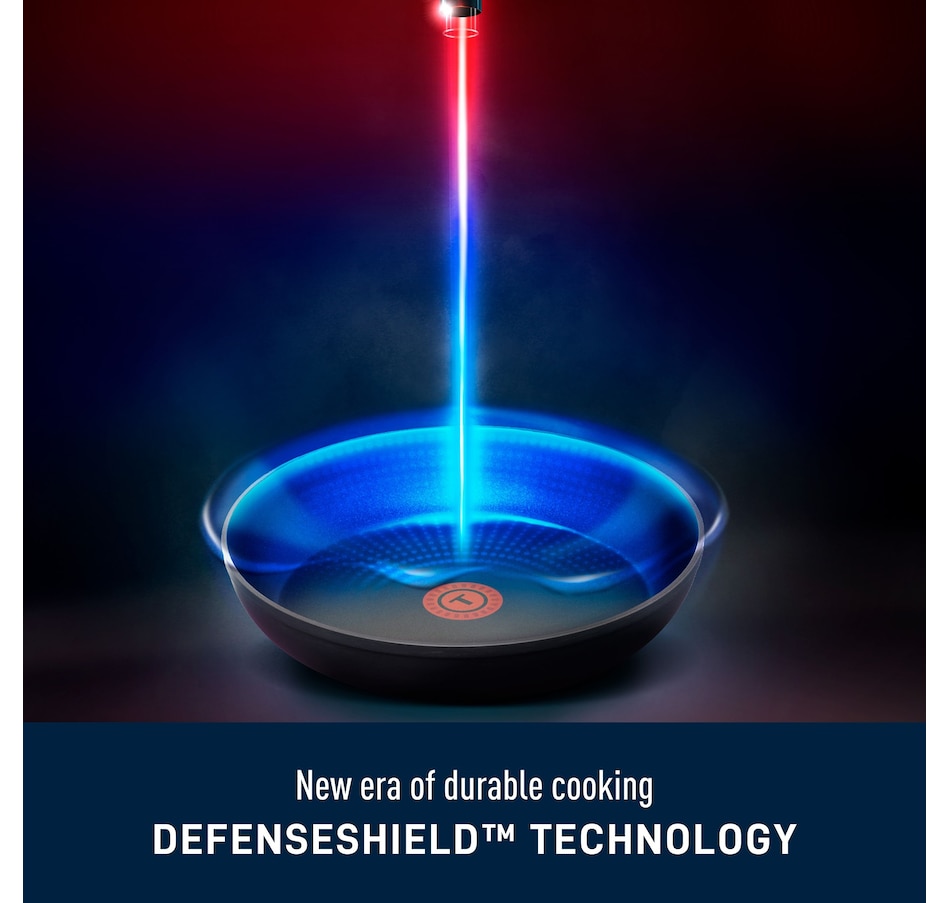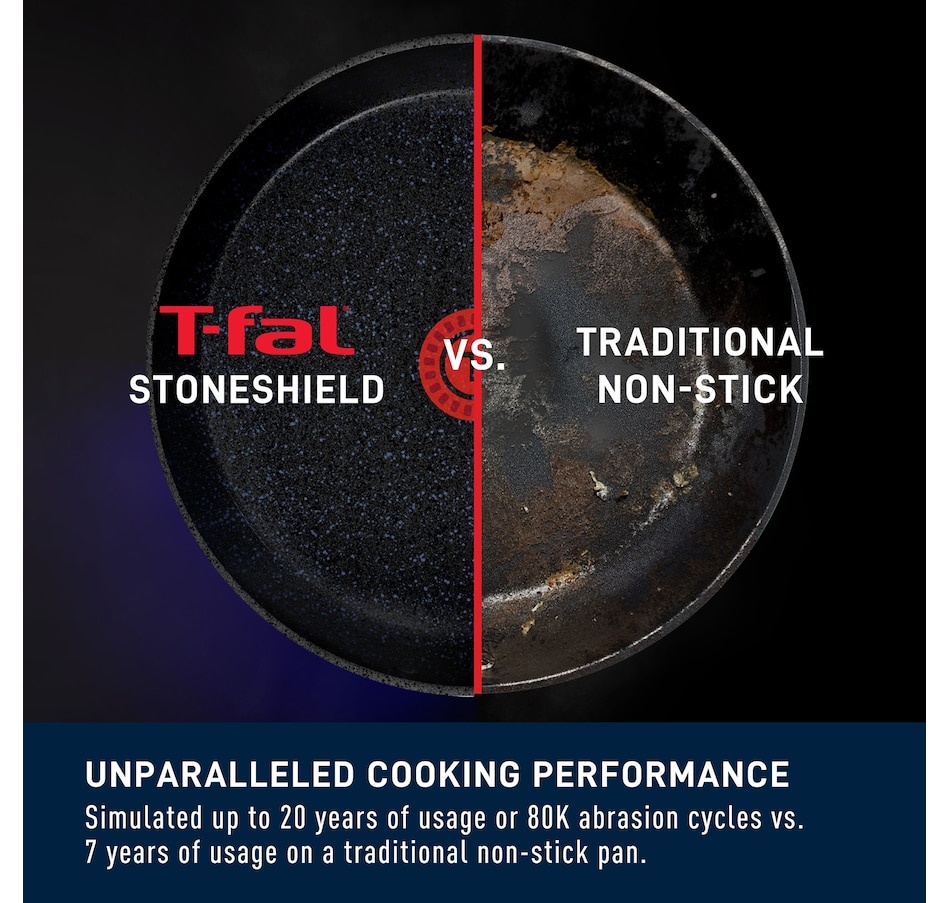 The T-fal StoneShield wok can revolutionize your kitchen. This premium cookware features the innovative DefenseShield Boost non-stick coating for surpreme resistance, which can ensure up to 20 years of intensive usage. The anti-warp six multi-layer construction strengthens its core and helps keep its shape over time, and the deep shape with its rugged rock texture helps guarantee durability.