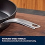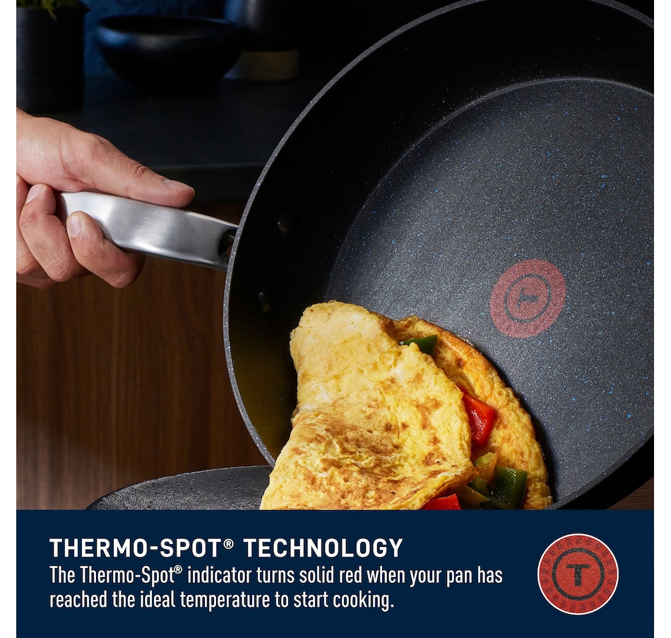 • Thermo-Spot indicator turns solid red when the pan has reached the ideal temperature to start cooking