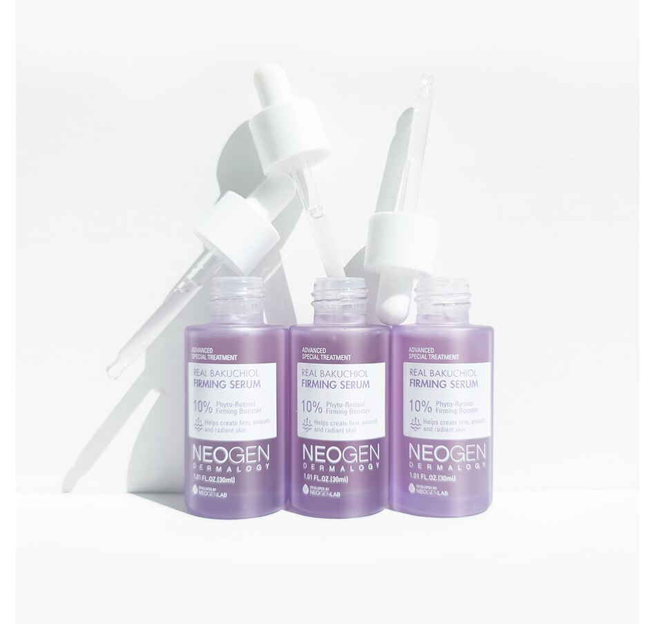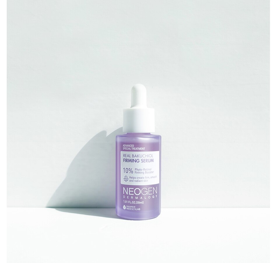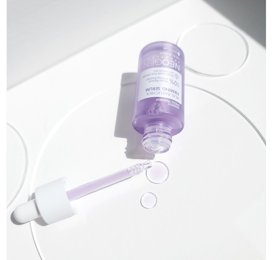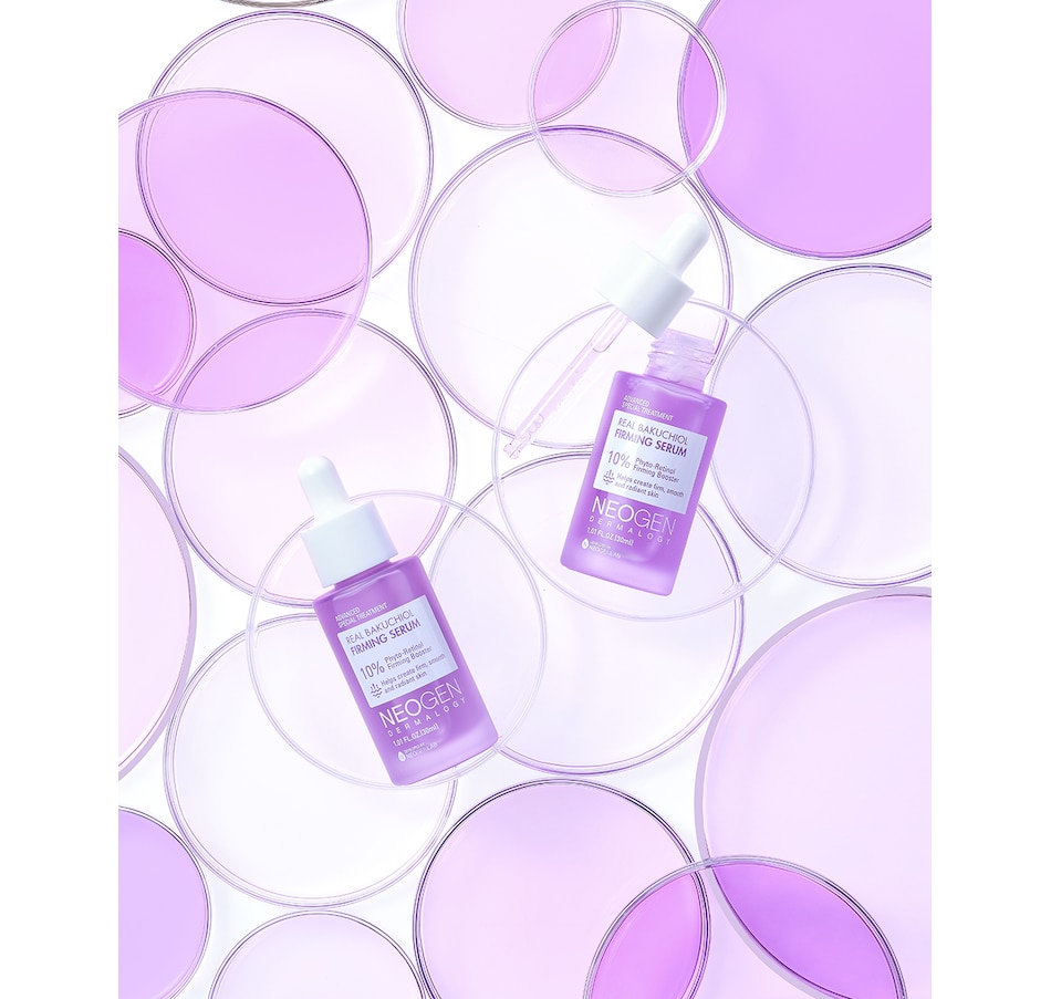 Neogen Real Bakuchiol Face Firming Anti-aging Serum helps to enhance collagen synthesis and elasticity. It contains 'bakuchiol*' for anti-aging.