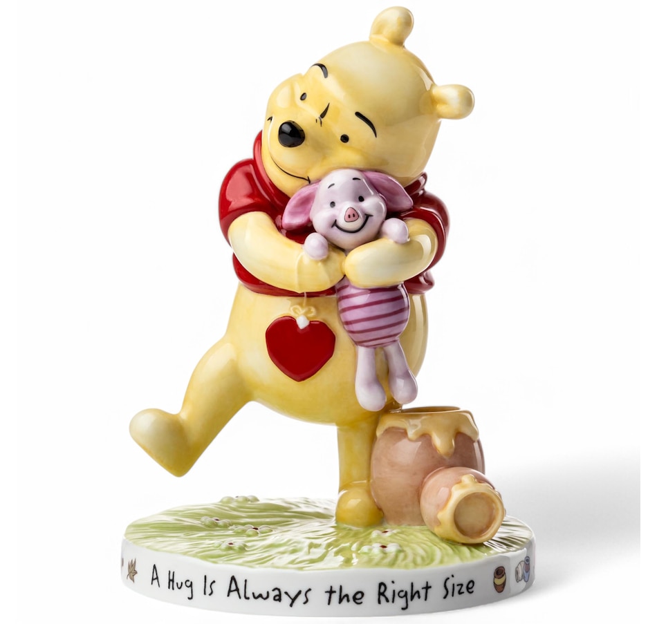 Experience the magic of Winnie the Pooh's enduring friendship with Piglet in this exquisite fine bone china figurine from The English Ladies. Meticulously crafted, this collector's piece captures the iconic embrace between Piglet and Pooh, with the quote "A Hug is Always the Right Size" along the base. With its harmonious blend of pastels, it's a heartfelt addition to any display and commemorates the joy found in the simplicity of cherished moments.