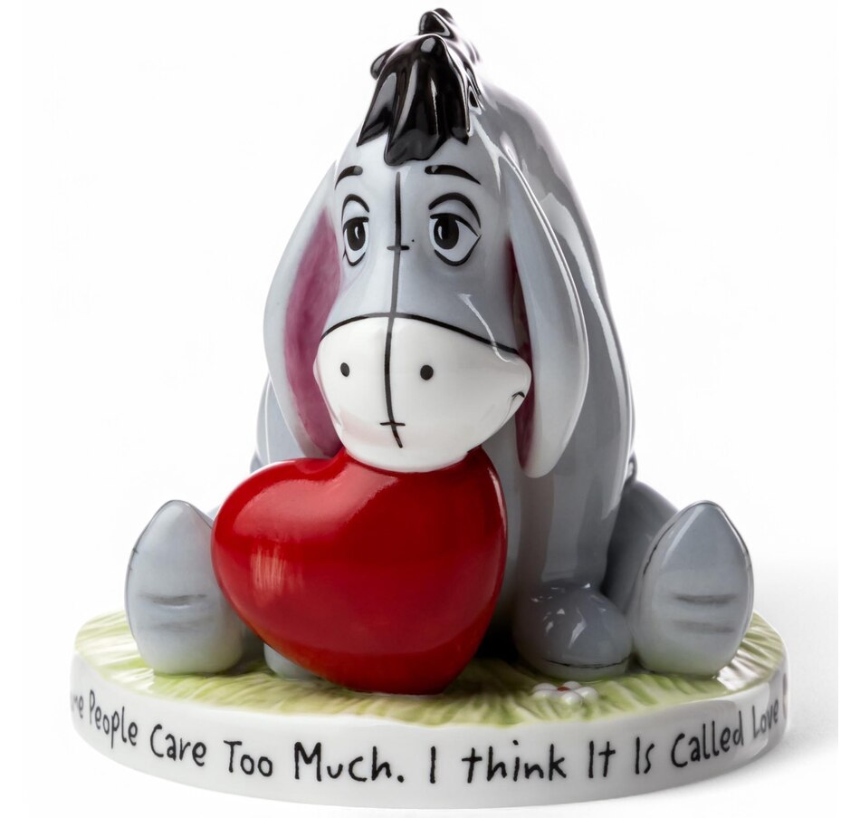 Discover the poignant beauty of Eeyore with this fine bone china figurine from The English Ladies, featuring the melancholic donkey cradling a huge red heart. Beautifully designed and handcrafted, this special piece portrays Eeyore's introspective charm, while the heart tenderly conveys the sentiment, "Some people care too much. I think it is called love." A graceful addition to any collection and display, this figurine captures the essence of love and compassion in the most endearing way, and it comes beautifully boxed for the perfect gift.