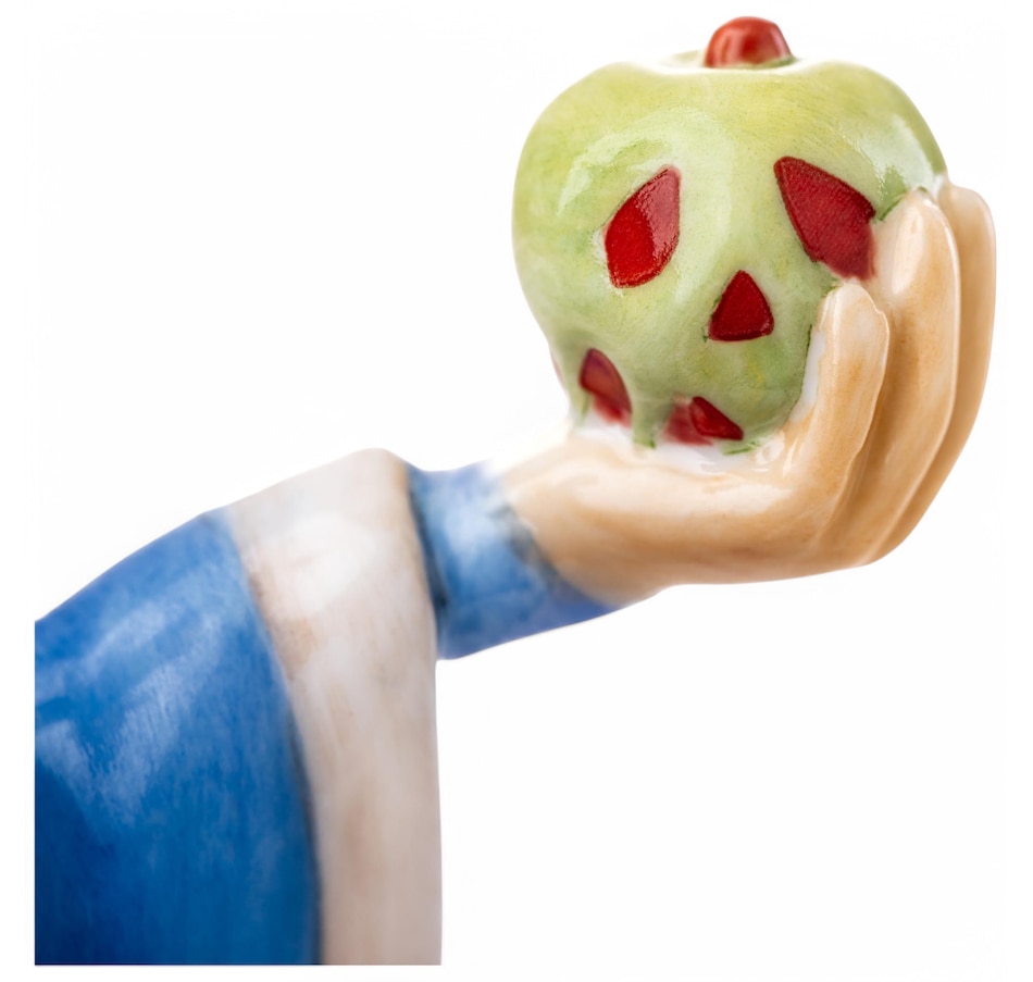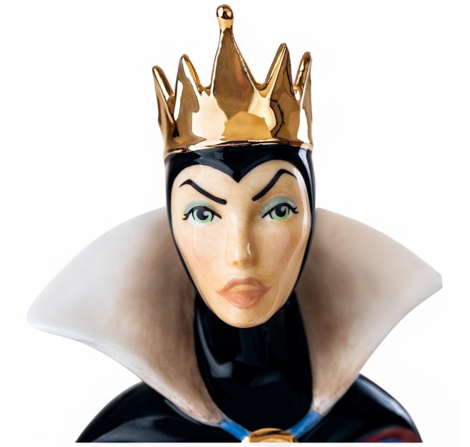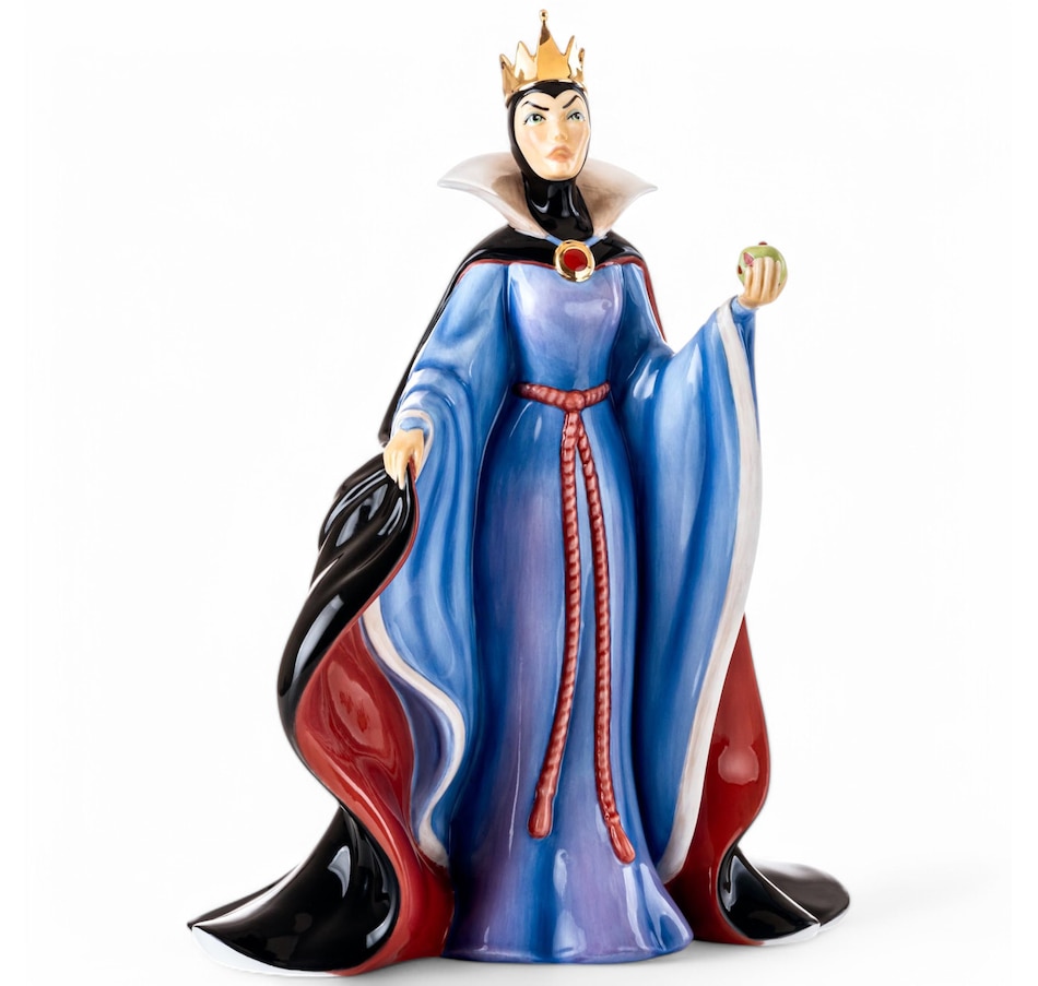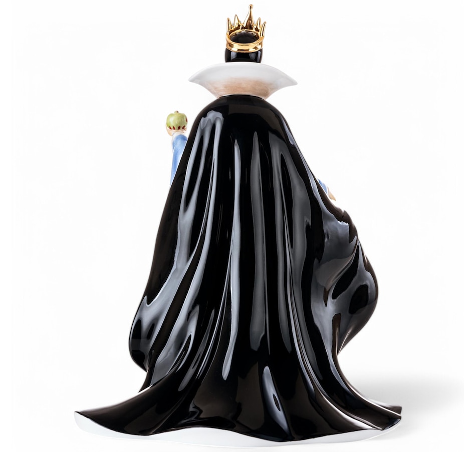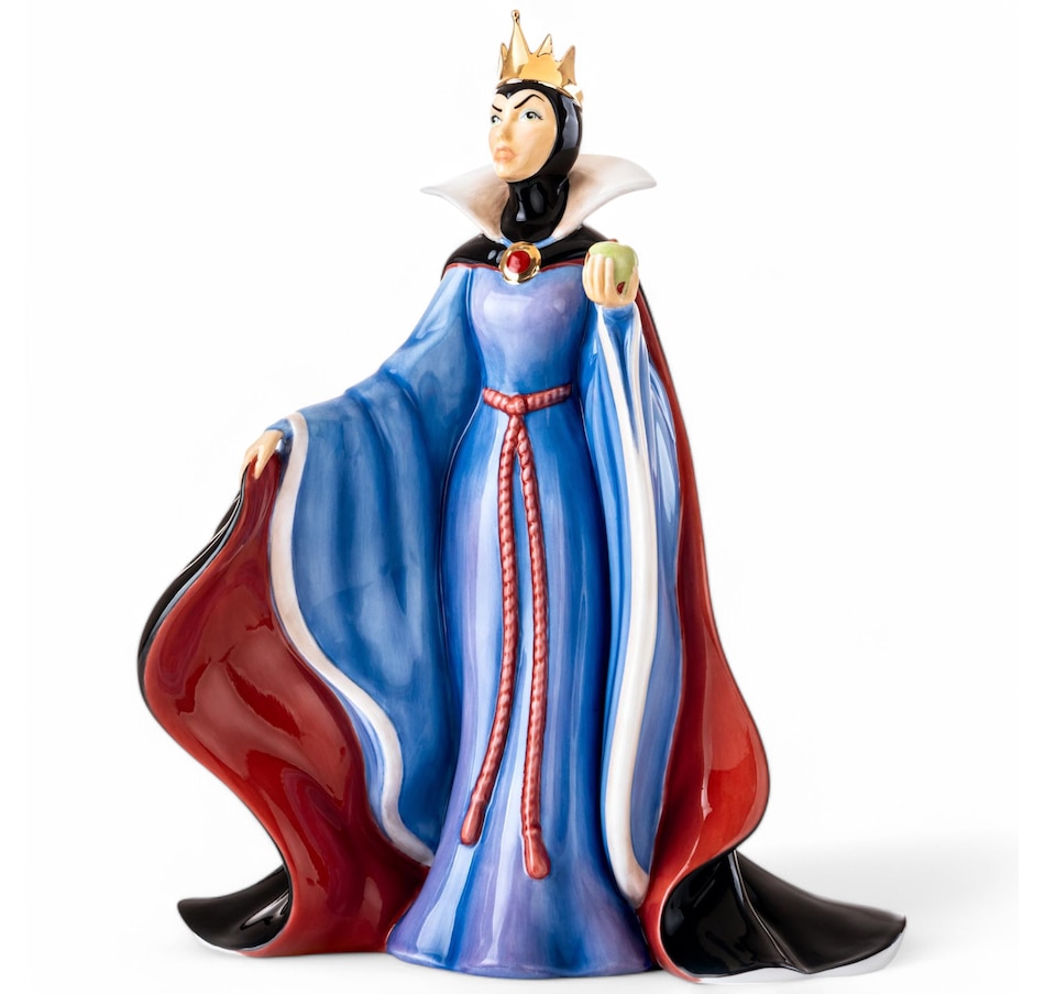 Inspired by Disney's original Snow White film is this Wicked Queen figurine from The English Ladies, a commanding addition to the Disney Villains Collection. Towering and conniving, the Wicked Queen is masterfully portrayed holding the iconic poisoned apple in one hand, while her billowing cloak adds an air of sinister elegance. Her intimidating crown, adorned in 22K gold, sits atop her regal visage, capturing the essence of her twisted ambition. Impressively crafted and hand-painted from fine bone china, this figurine makes a captivating centrepiece, inviting you to delve into the haunting depths of Snow White's villainous narrative. Gift-boxed to preserve its dark charm, this figurine is a must-have for Disney enthusiasts, bringing the essence of villainy to any collection.