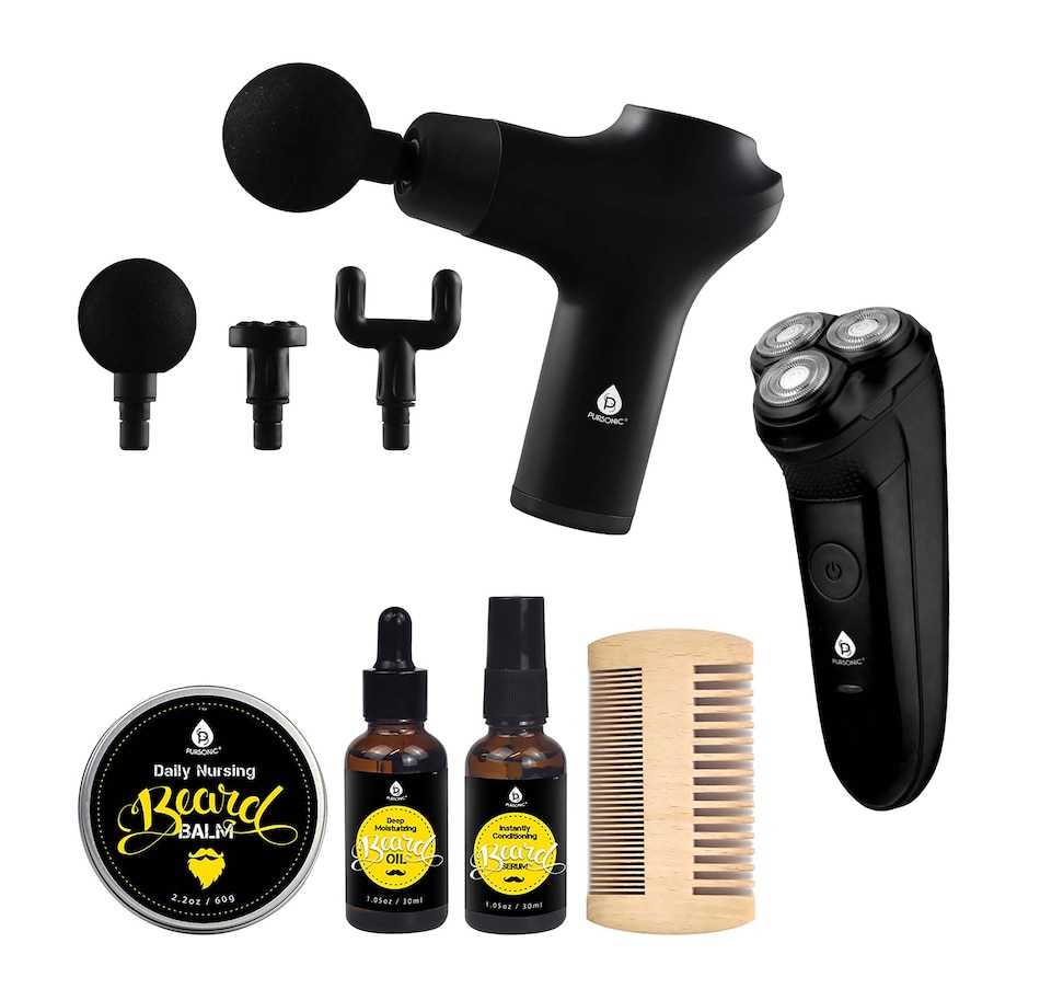 Master the art of grooming and unwind in style with the Ultimate Men's Grooming & Relaxation Bundle. Featuring the Pursonic Beard Care Kit, Mario Lopez Men's Rechargeable Electric Shaver, and Pursonic 3-Speed Cordless Massage Gun, this bundle combines precision grooming with powerful relaxation tools to keep you looking and feeling your best. Perfect for self-care or as a thoughtful gift for any man who values both style and comfort.Bundle Includes:1. Pursonic Beard Care Grooming Kit (4 Pieces)Achieve the perfect beard with this all-in-one set designed to nourish, style, and maintain your facial hair.Beard Oil (30ml): Deeply moisturizes and nourishes with vitamin E and golden jojoba oil for a smooth, healthy beard.Beard Balm (60g): Shapes and holds your beard while adding a natural shine for all-day style.Beard Serum (30ml): Cleanses and hydrates to prevent dryness, itching, and clogged pores.Beard Comb: Tame and style with ease for a polished look.2. Pursonic – Mario Lopez Men’s Rechargeable Electric ShaverUpgrade your shaving routine with advanced technology for a close and comfortable shave.3D Floating Blades: Adjust to facial contours for precise, irritation-free shaving.Double Ring Knife Net: Covers more surface area for efficient, faster shaving.60-Minute Runtime & Quick Charge: Long-lasting performance with a 5-minute quick charge for last-minute touch-ups.Washable Blades: Easy to clean for hygiene and convenience.3. Pursonic 3-Speed Cordless & Rechargeable Professional Massage GunRelax and recover with targeted muscle relief using this versatile massage gun.3 Speed Settings: Tailor your massage from gentle relaxation to deep tissue therapy.3 Attachments: Round head for large muscles, bullet head for pinpoint targeting, and flat head for all-over relief.Quiet & Portable: Whisper-quiet motor and ergonomic design for use at home, the gym, or on the go.Rechargeable Battery: Long-lasting power for uninterrupted relaxation sessions.Why Choose the Ultimate Men’s Grooming & Relaxation Bundle?Complete Grooming & Wellness Solution: A comprehensive set for head-to-toe care.Premium Quality & Performance: High-grade materials and advanced features for lasting results.Perfect Gift Idea: Treat yourself or surprise a loved one with this thoughtfully curated bundle.Transform your grooming routine and recovery experience with this all-in-one package of style and relaxation. Order now and step into your best version of comfort and confidence.