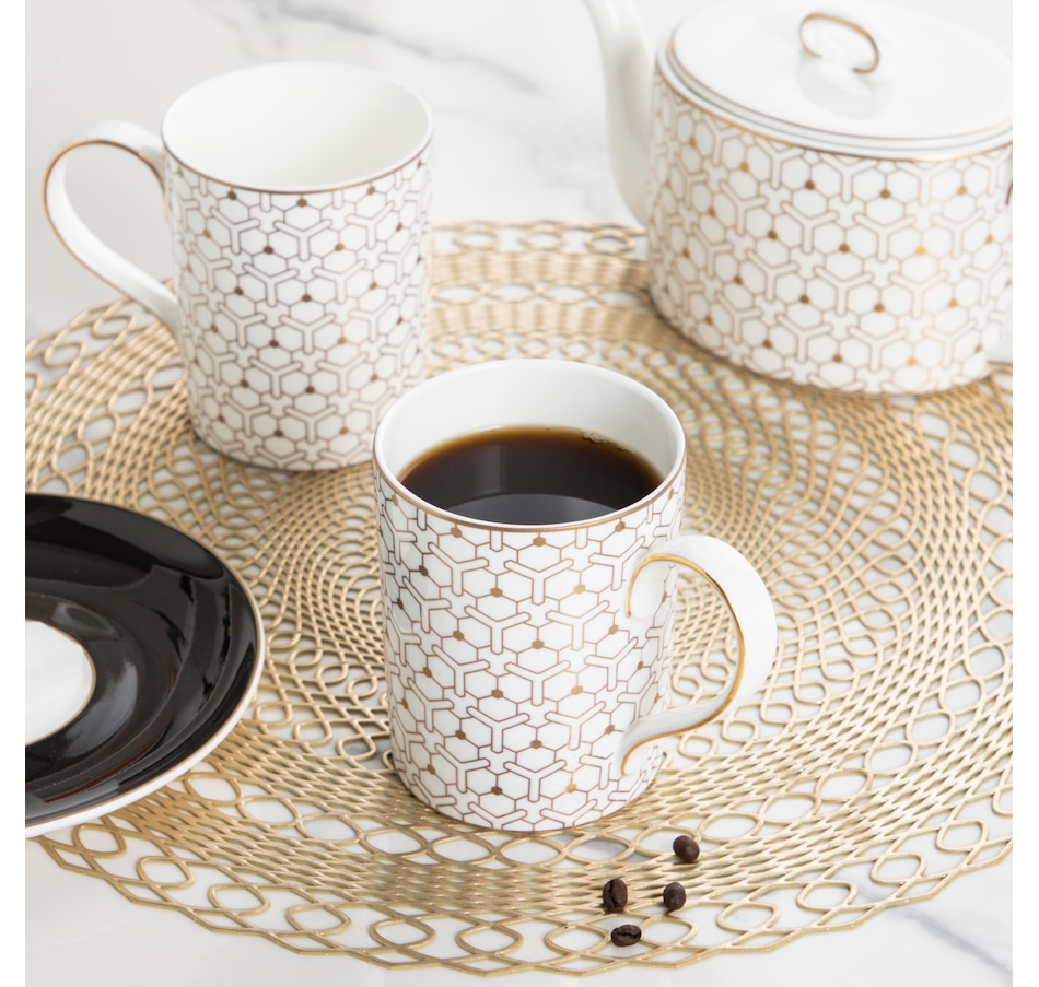 Fine Bone China is an excellent choice for an affordable and ethically appealing alternative for everyday teaware. The Fine Bone China collection combines durability with style, perfectly complementing contemporary table settings. This teaware is chip-resistant and keeps your tea warm for a long time. Our designs include solid-colored, striking patterns, ideal for modern and lively tea enthusiasts. Enjoy tea in your garden with these premium quality and exquisitely designed tea wares. Selecting the right teaware is crucial, and Fine Bone China ensures top performance for your tea-making needs..[Premium Material} Bring the hotel luxury home with for an affordable and ethically appealing alternative for everyday teaware. Combines durability with style, perfectly complementing contemporary table settings. Chip-resistant and keeps your tea warm for a long time. .[Design] Includes solid-colored, striking patterns. Ideal for modern and lively tea enthusiasts. Premium quality and exquisitely designed tea wares. Perfect for a relaxing tea experience in your garden and home..[Note] Do not use in microwave or on stovetop. The metallic trim can cause sparks and damage the appliance. Bone china is delicate and may be damaged by direct heat..Set of 2 Coffee Mugs. Size of Coffee Mug: 350 cc