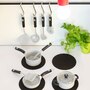 Budding professional chefs will appreciate everything included in this high-quality set. You put the solid pots made of high-quality plastic on the play kitchen stove, cover one or the other as required, add the pan and sizzle, simmer and stir whatever your heart desires! You can even skim foam from the pot with a special spoon, or cut pizza with the pizza cutter in a realistic fashion. With these kitchen appliances you have everything you need to conjure up a fantastic meal in a game of pretend that encourages creativity and motor skills.