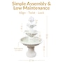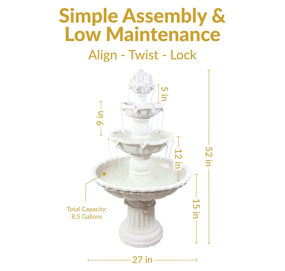 Add charm and tranquility to any outdoor space with this 3-tiered fountain featuring a decorative fruit topper and elegant white finish. Designed to create a peaceful retreat, it delivers the soothing sound of cascading water while enhancing patios, gardens, and landscaped areas with its timeless style. The fiberglass construction offers a realistic stone appearance while remaining lightweight, durable, and resistant to weather. With a height of 52" and a 31" diameter, this fountain makes a bold yet refined statement. It holds up to 8.5 gallons of water and weighs just 50 pounds, making it easy to position as desired. The electric-powered pump keeps water flowing smoothly through each tier, creating a constant, calming ambiance. Birds are naturally drawn to the sound and movement, adding to the relaxing, nature-inspired atmosphere. Assembly is simple with a spin-and-lock mechanism, allowing for quick setup. Whether placed in a backyard, on a patio, or among flower beds, this contemporary outdoor fountain blends functionality with graceful design to elevate any environment.