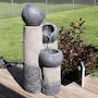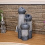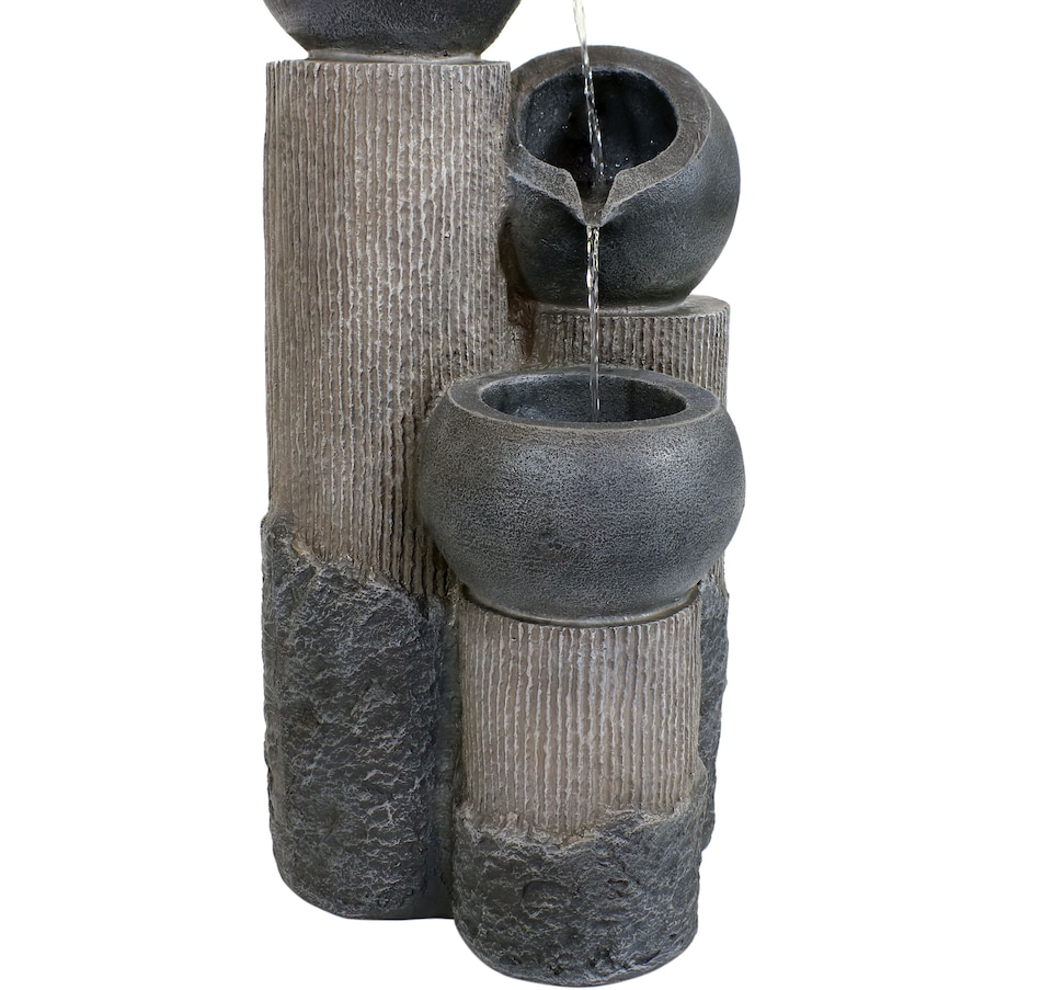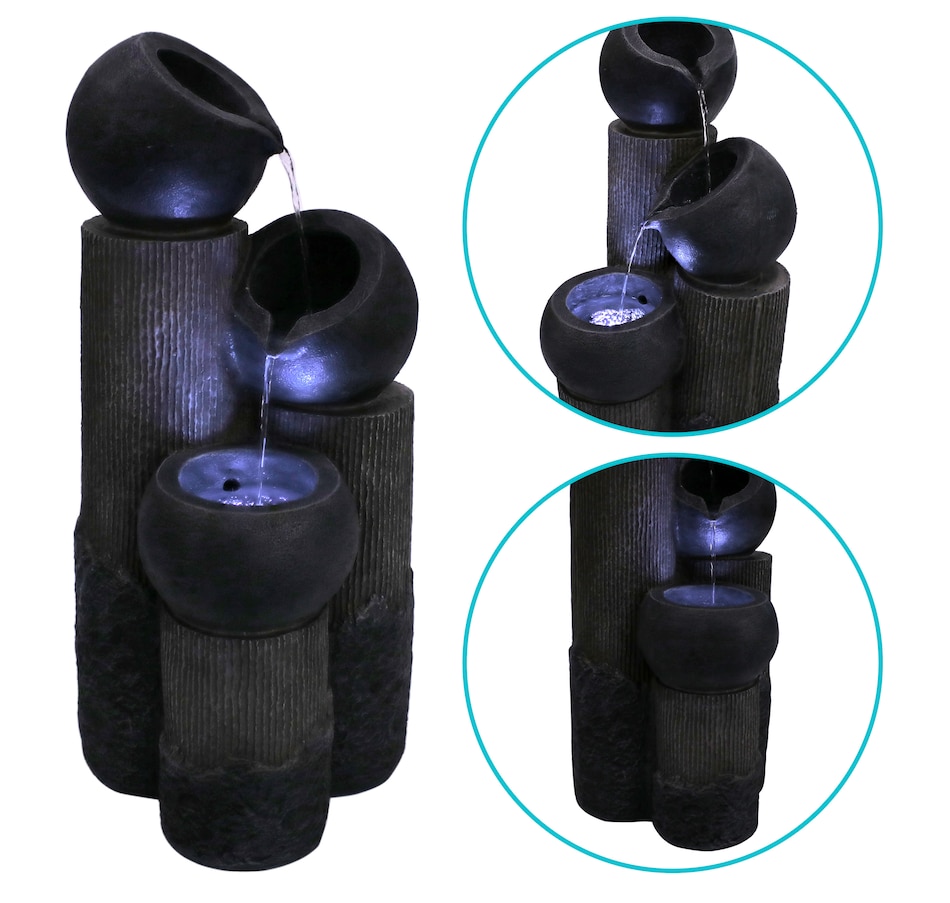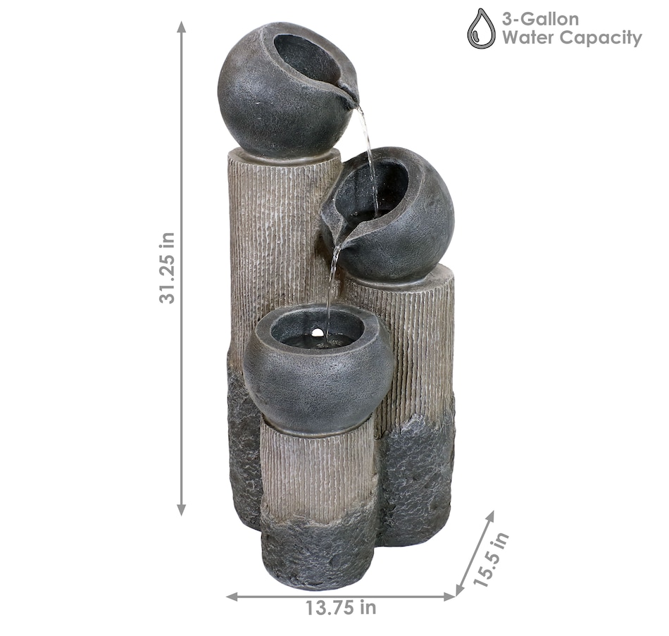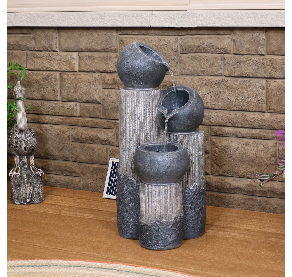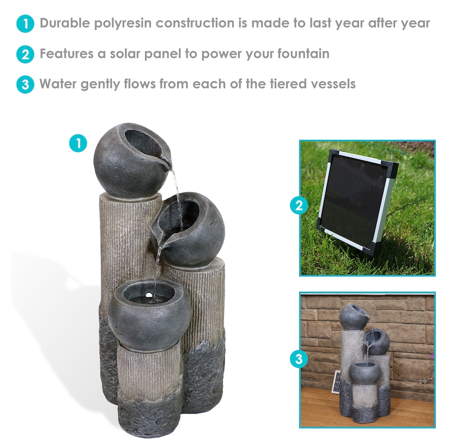 Update any patio or lawn with this decorative and relaxing solar water fountain featuring a backup battery. Constructed of durable and easy-to-maintain polyresin, this fountain is lightweight, easy to move anywhere, and is resistant to the elements outdoors. Also, this tiered outdoor water feature is designed with a variety of textures and neutral colors to enhance any outdoor living space. Water gently flows from each of the tiered vessels for a peaceful decorative accent that harnesses the power of the sun via the included solar panel. When the solar panel is in direct sunlight, the pump will be powered by solar energy and the battery pack will recharge. Once fully charged, the battery will power the fountain for up to 4 hours. The battery will also automatically run the fountain when it is cloudy or nighttime.
