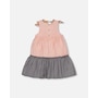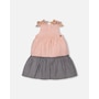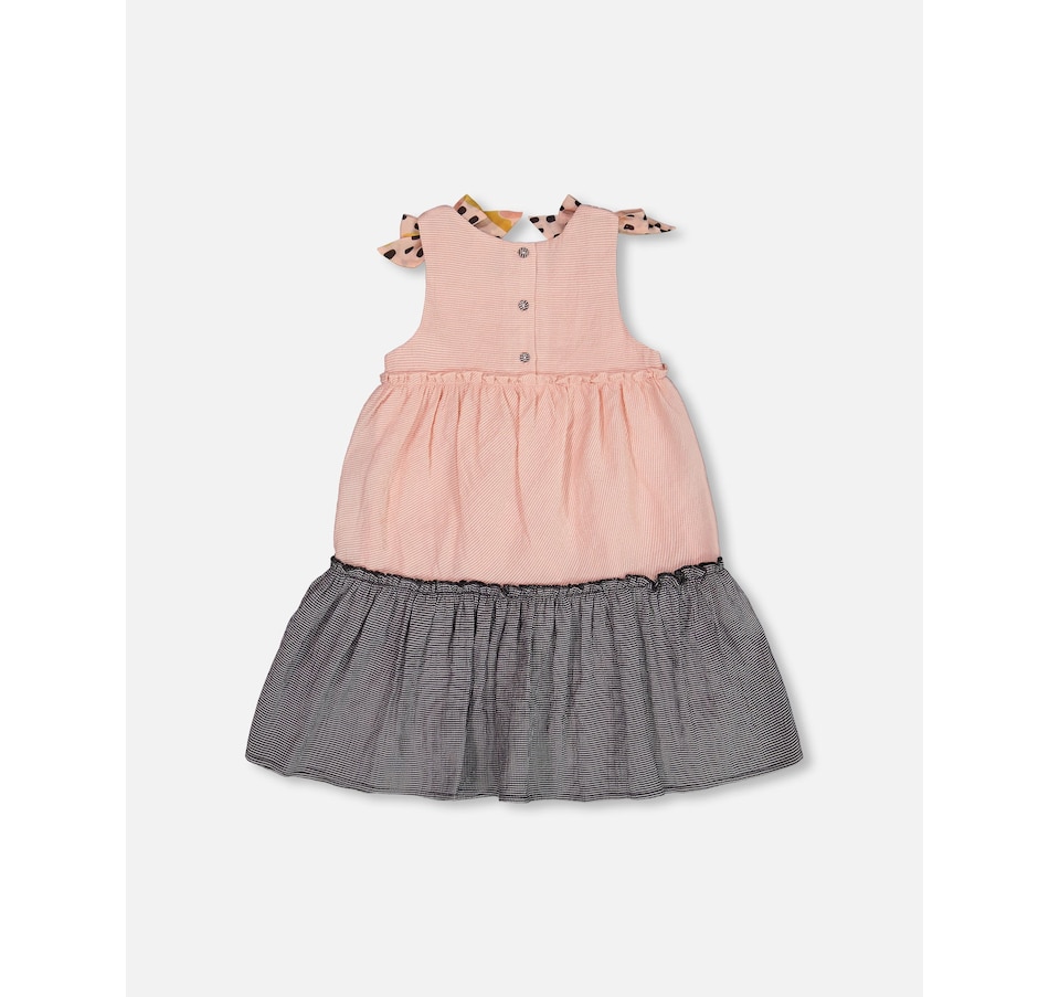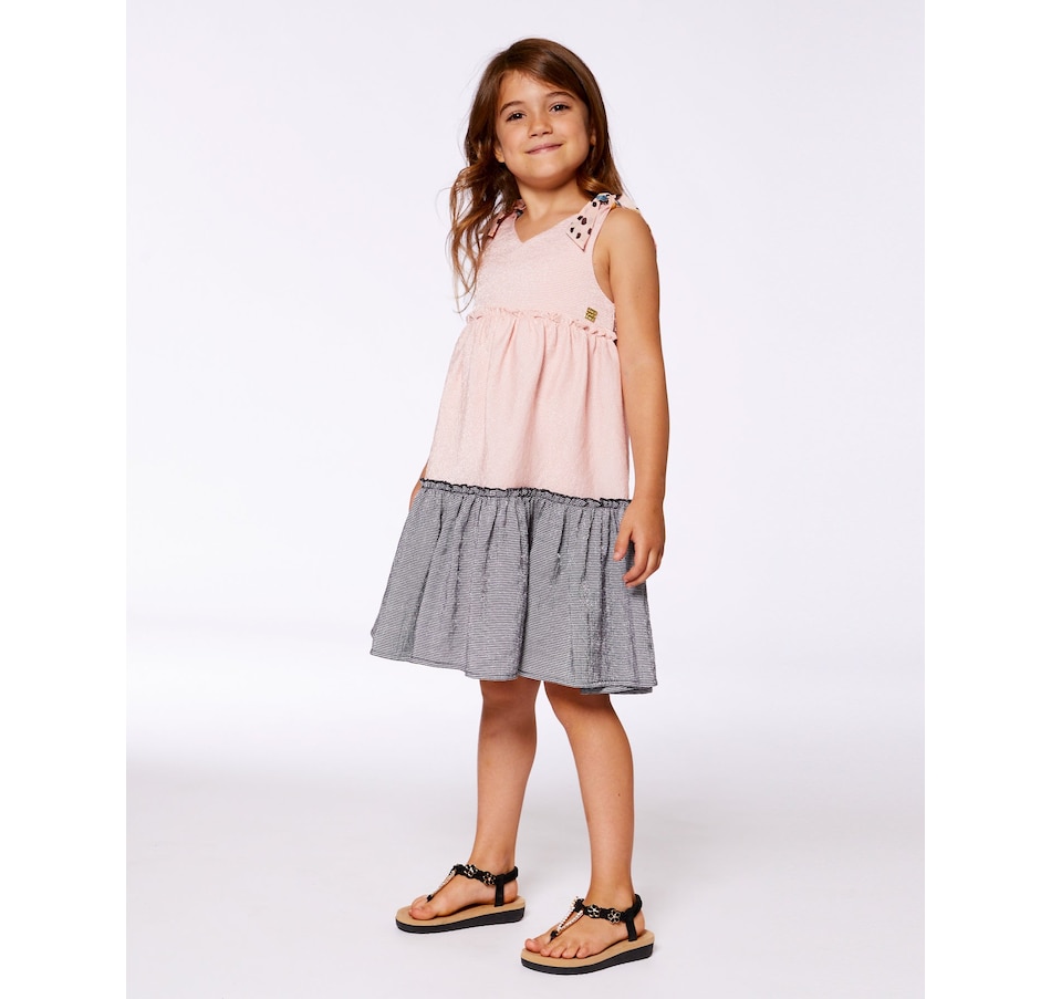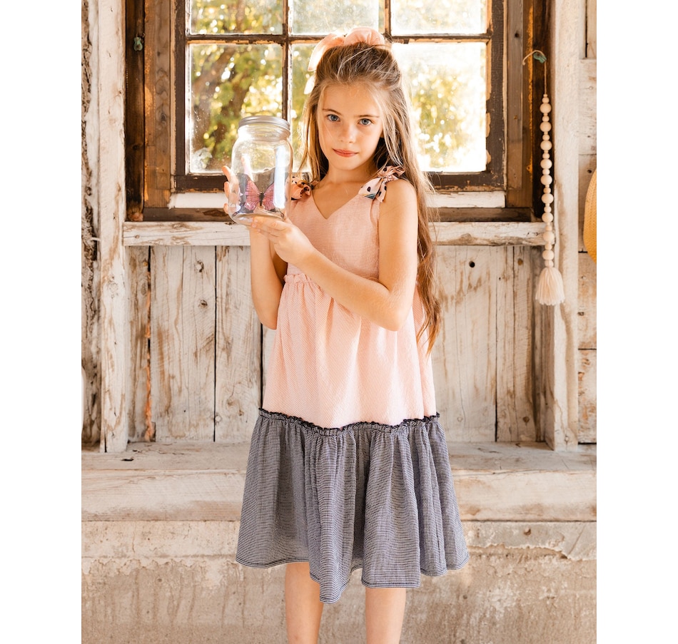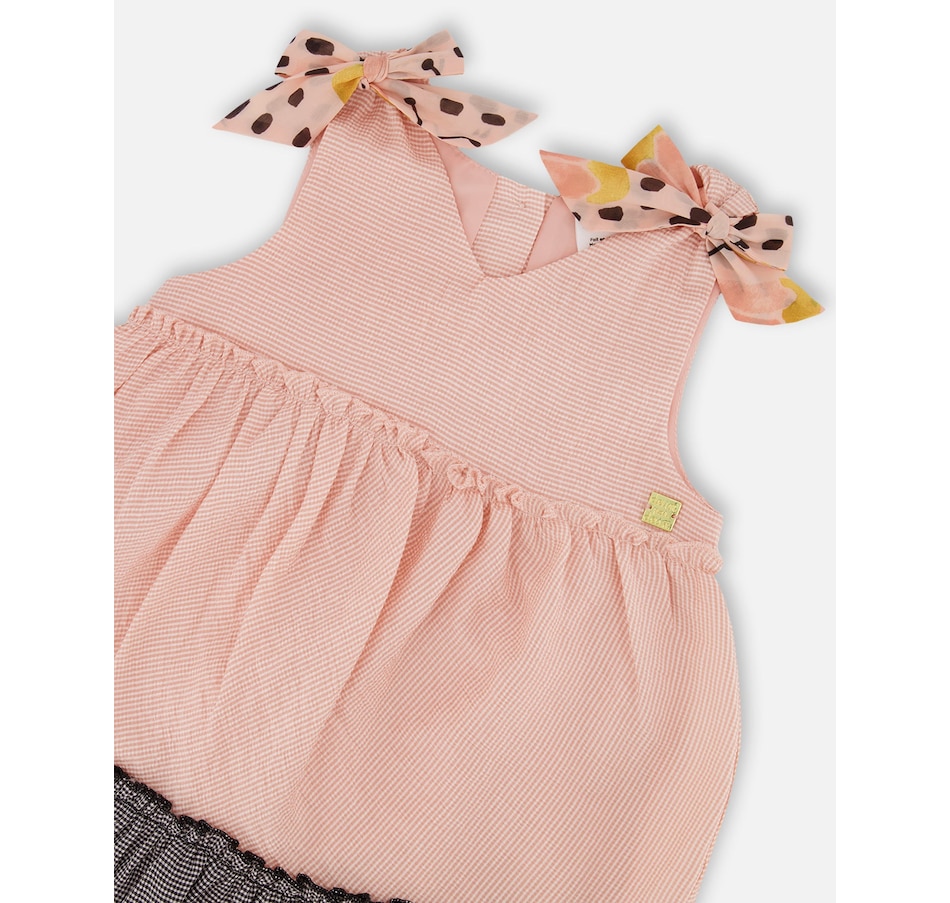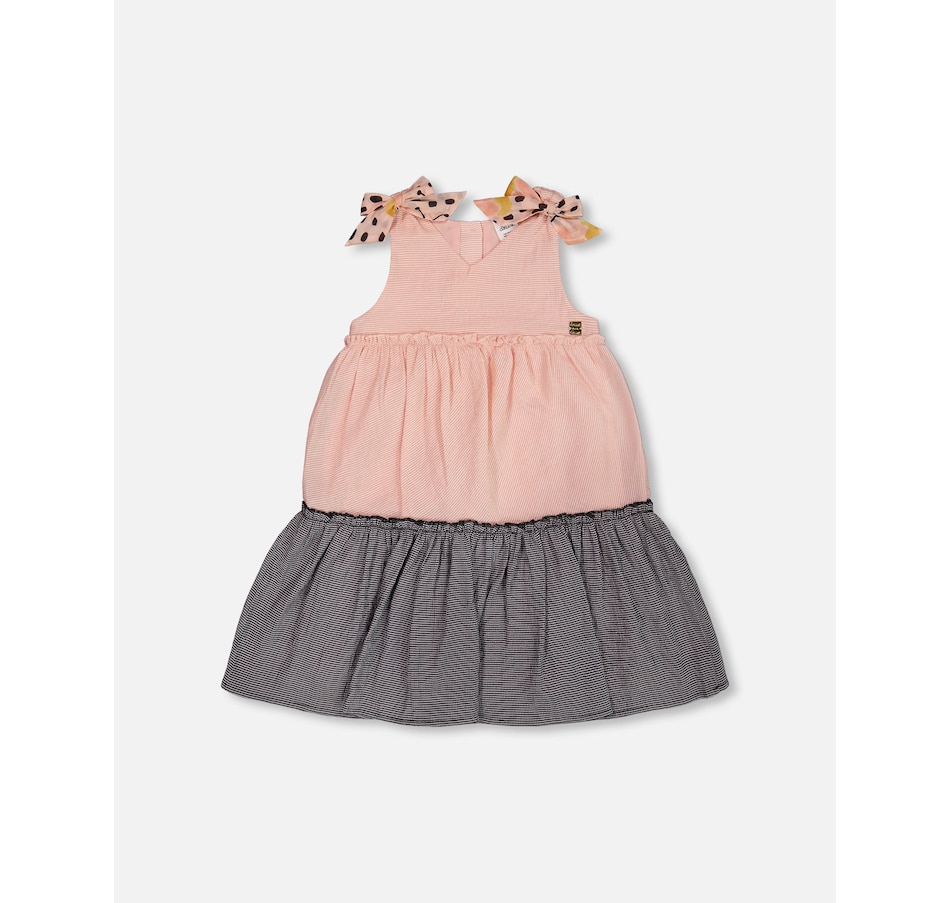 Our Tiered Dress with Bows Pink and Black offers a timeless look with a fun, playful twist. This sleeveless dress is made from a soft viscose/poly/nylon blend and features an A-line silhouette with a sleeveless bodice, wide straps, and a V-neckline. Contrast butterfly print bows on each shoulder make it even more charming!