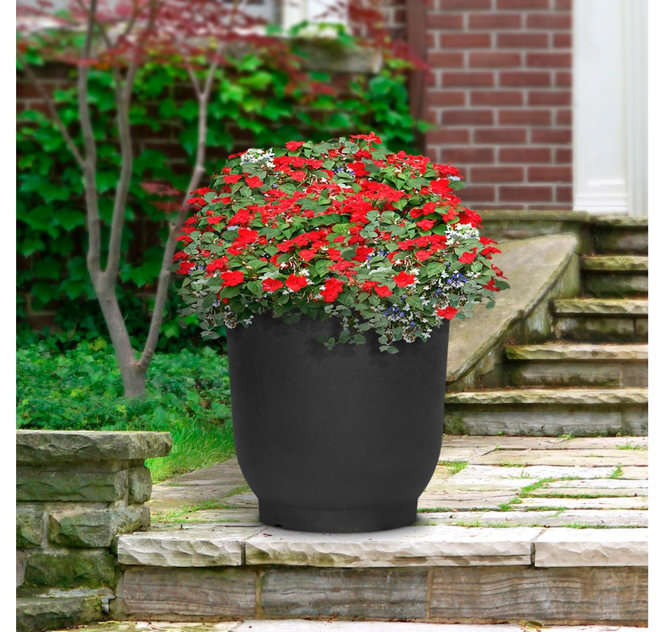 The Tierra Verde Florencia Modern Round extra large self-watering indoor/outdoor statement planter is an elegant and eco-friendly choice for any outdoor living space, patio, or indoor area. Crafted from recycled material, this sleek planter is designed to withstand the elements, offering durability for all seasons. Featuring a raised insert that creates an interior self-watering system, it means plants stay hydrated with ease. The water reservoir at the base allows plant roots to stretch down into the water, providing nourishment and promoting healthy growth. When used outside, a plug on the bottom may be removed to drain excess water. Ideal for busy plant owners, especially those who travel, this feature keeps your plants well-maintained with minimal effort. Tierra Verde planters are tested in -40 to 40 degree weather, making it suitable for year-round use. Ideal for a variety of plants, this Tierra Verde planter brings both practicality and sophistication to your space, and is made locally in North America.