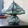 Inspired by the Hanging Head Dragonfly lamp originally designed by Louis Comfort Tiffany and Clara Driscoll, this mini version encompasses great detail and lively character. The dragonflies, buzzing above the elements of green, orange and yellow glass cuts, leaves you with a feeling of serenity. The base is detailed with dragonflies and mosaic glass pieces.