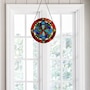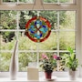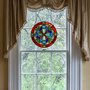 This stained-glass window panel can instantly elevate the look of any room. It features a round shape with a cool geometric floral-like symmetrical pattern, and is handcrafted from four amber cabochons and 113 individual glass cuts in red, blue, teal and green shades with hints of clear glass. This decorative window panel is made with artisanal soldering methods, and the included 24-inch metal chain allows for immediate and effortless hanging. Whether displayed in your bedroom, living room or another sunny window, the panel can bring a warm array of colourful light into your space when the sunlight passes through it.