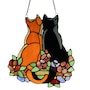 A ginger cat and black cat gaze into the distance as they sit in the garden, artfully crafted from 82-pieces of hand cut stained glass and accented with with four bright round cabochons, this piece is perfect for any room. The stained glass pieces soldered together using the copper foil method, a technique made famous by Louis Comfort Tiffany in the early 1900s.