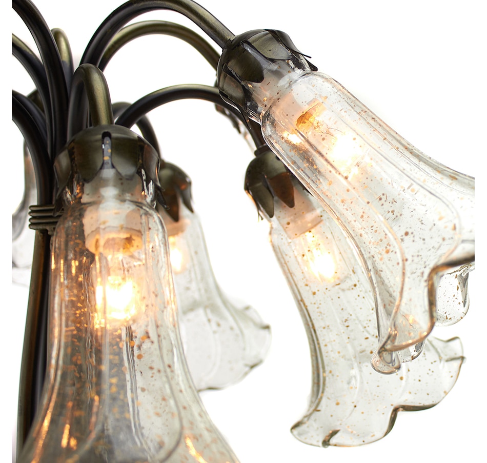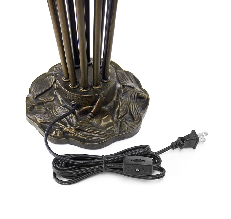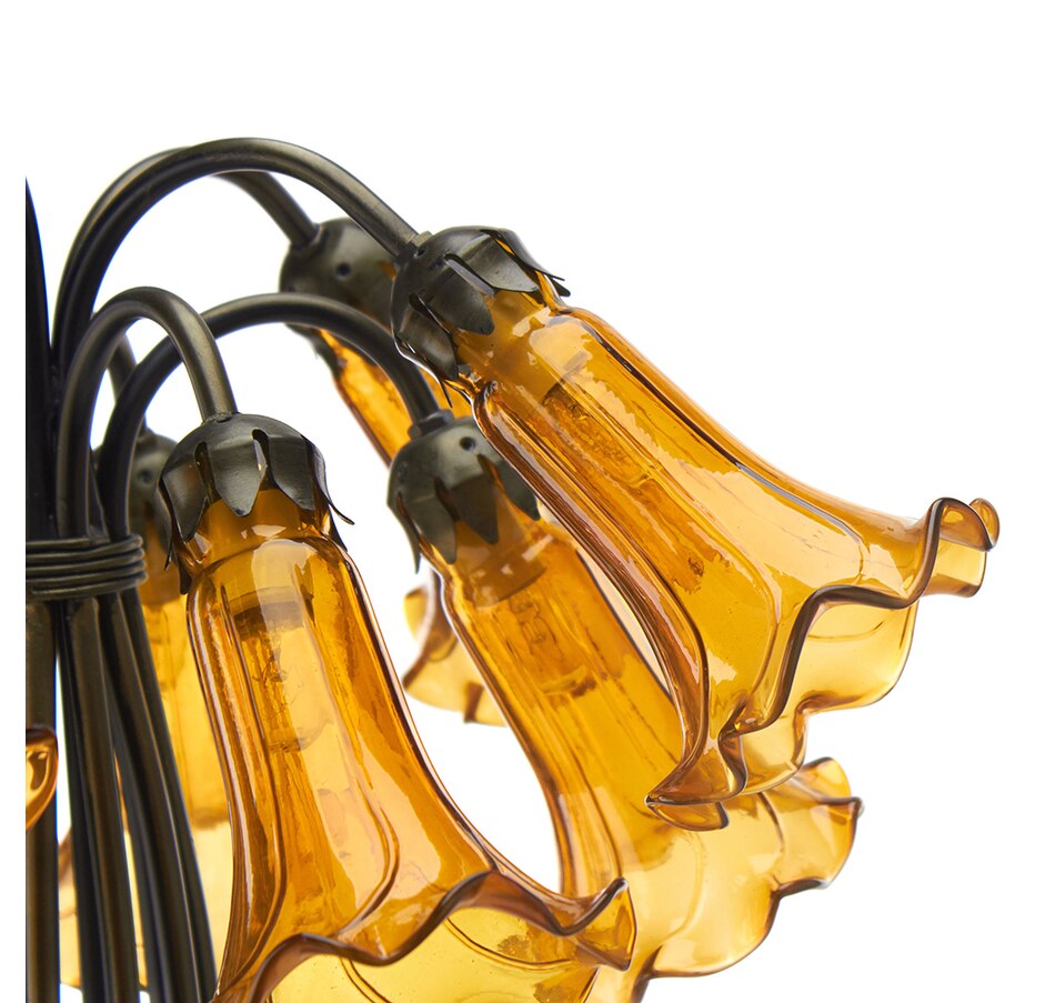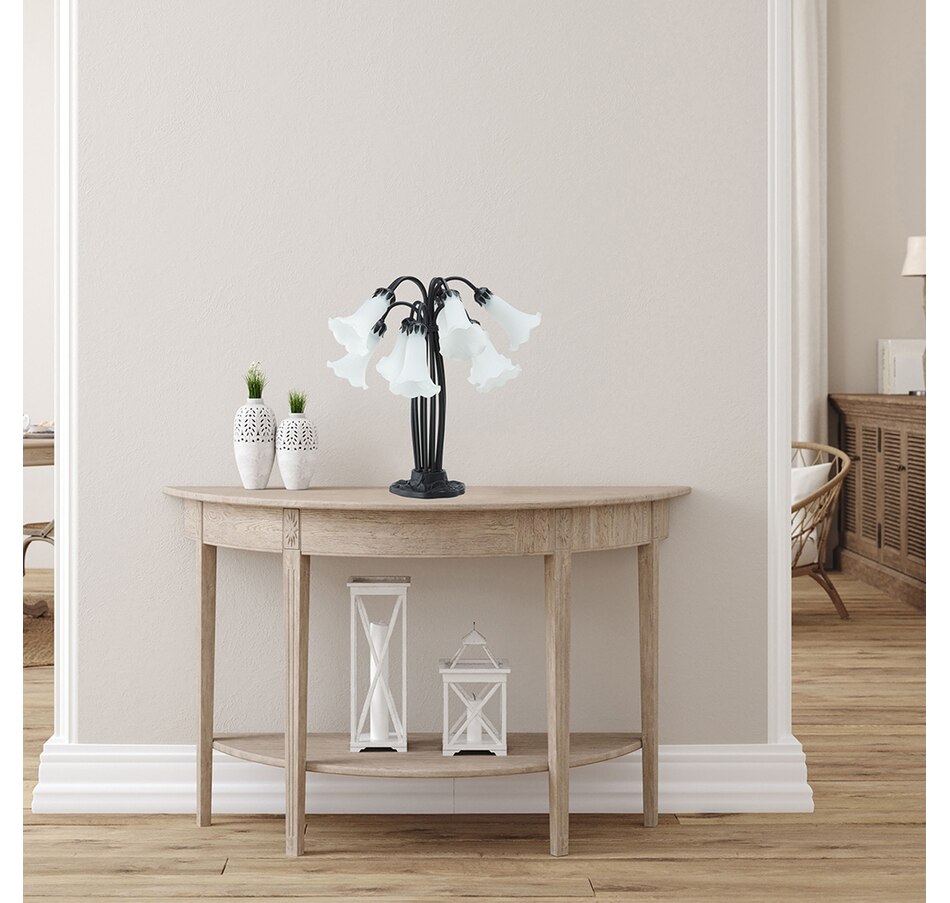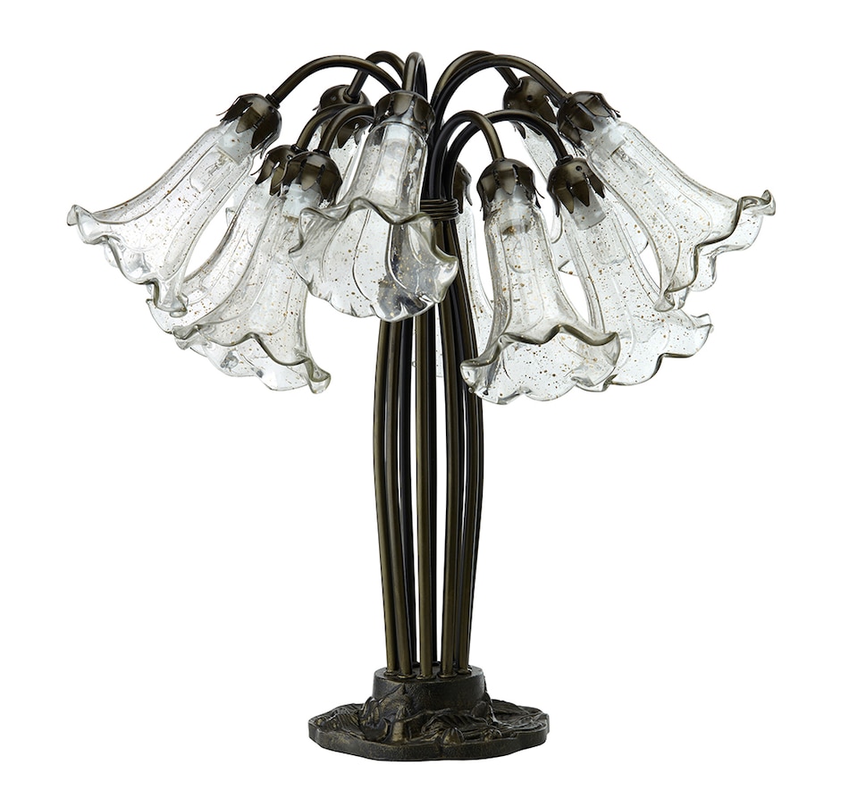 This table lamp from marries vintage and traditional styles to create a beautiful and unique lighting option for a bedroom, living room or entryway. Showcasing a brushed bronze-finish novelty metal base that depicts stems leading up to floral-style clear with gold-coloured flecks glass bell shades, it casts a soft glow with a ten 15-watt E12 bulb (not included). A great pairing with Bohemian, transitional or eclectic décor, the lamp also features a 65-inch cord with an in-line switch for versatile placement.