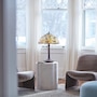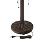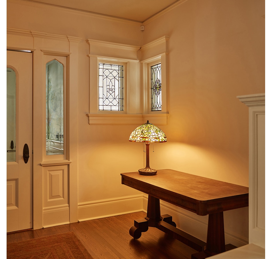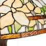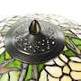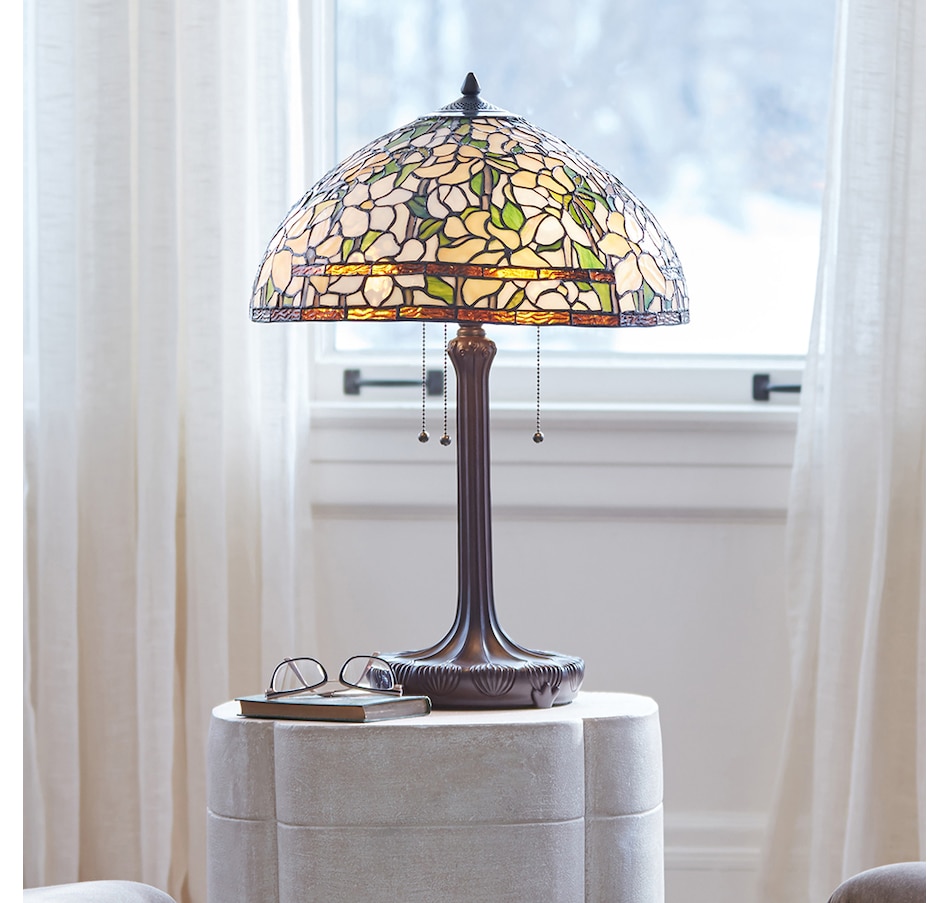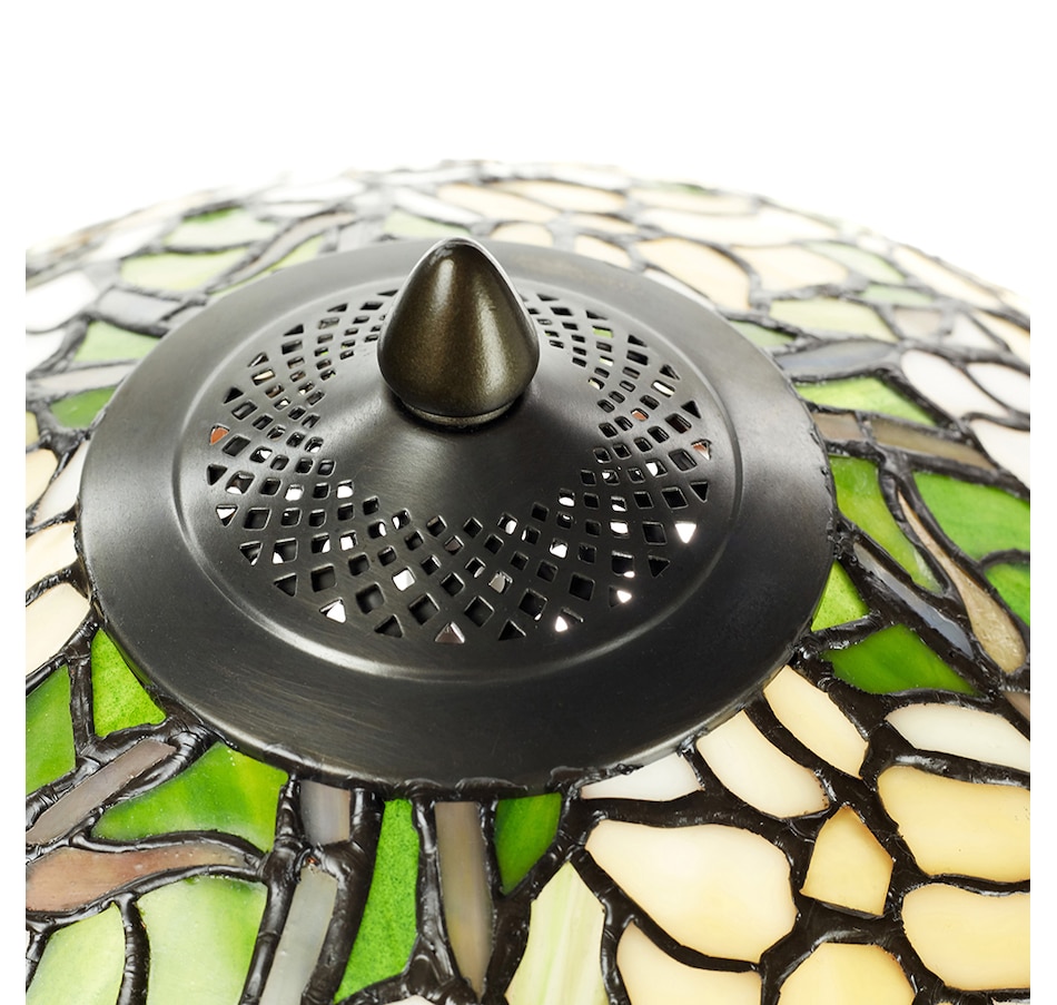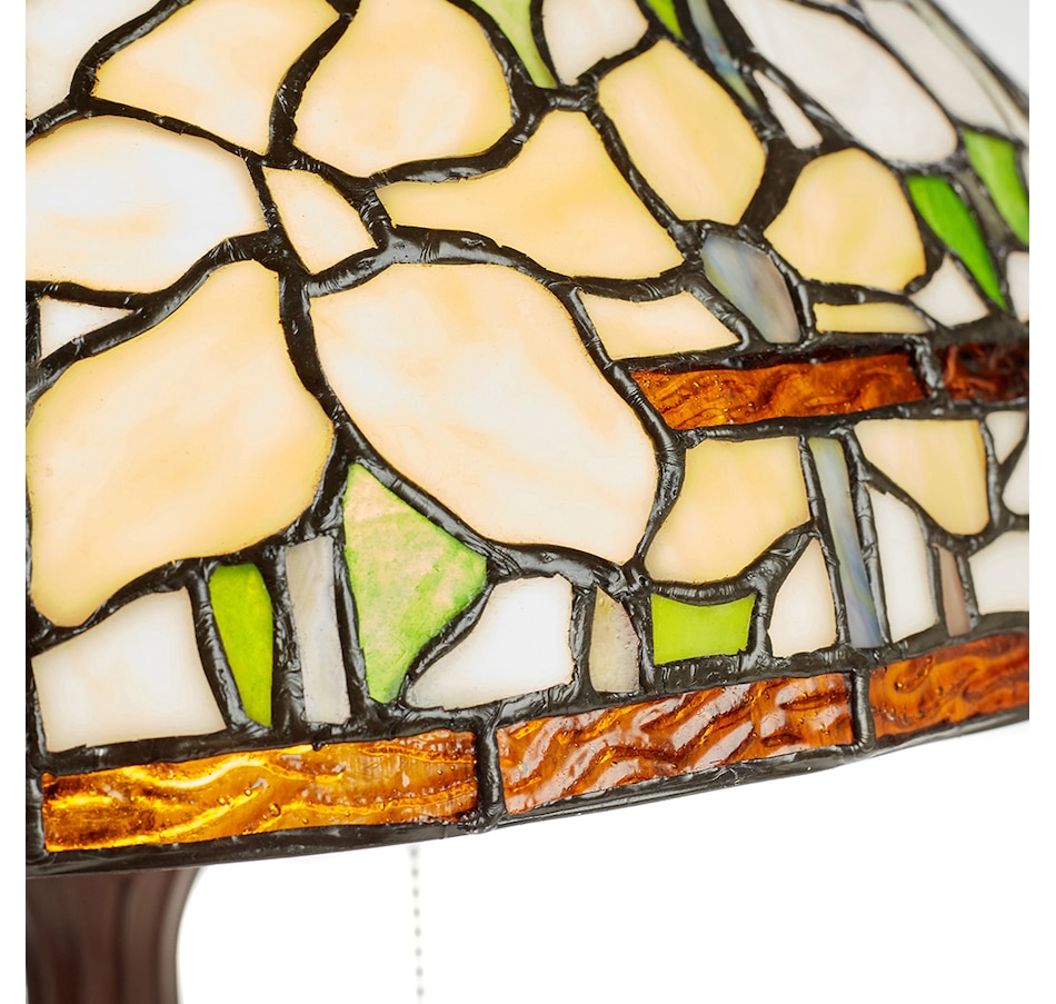 This traditional Tiffany-style table lamp features an antique bronze-finish novelty base and a classic dome shade with a stained glass design depicting daffodils in bloom in green, yellow and white. It features a tree trunk style base made of antique bronze-finished polyresin. Its shade features a daffodil design with 725 individual glass cuts.